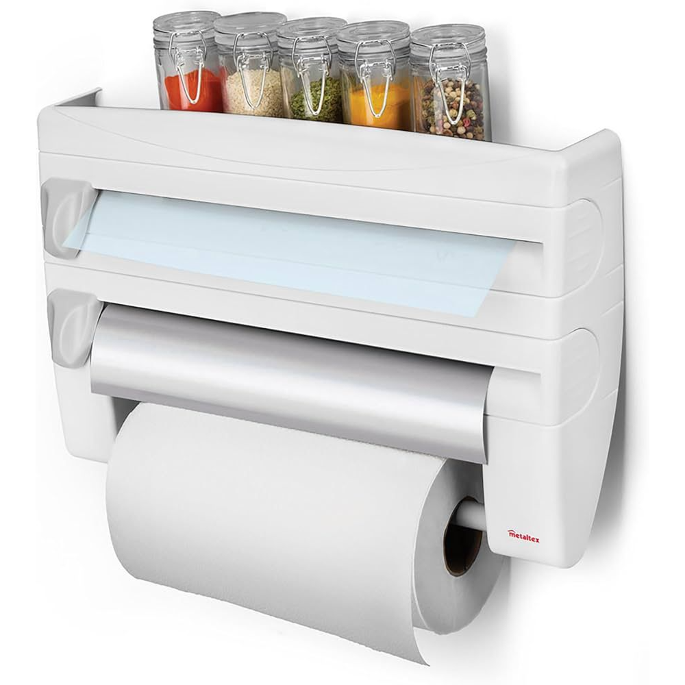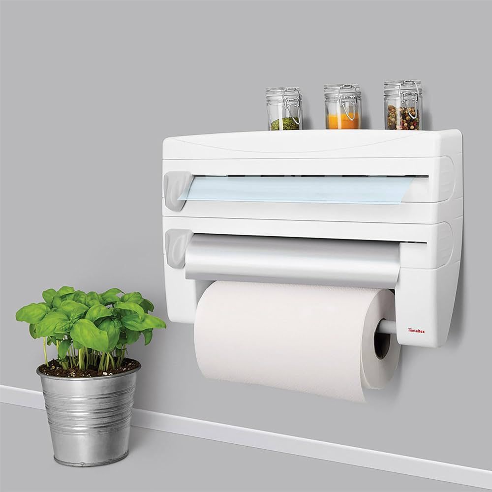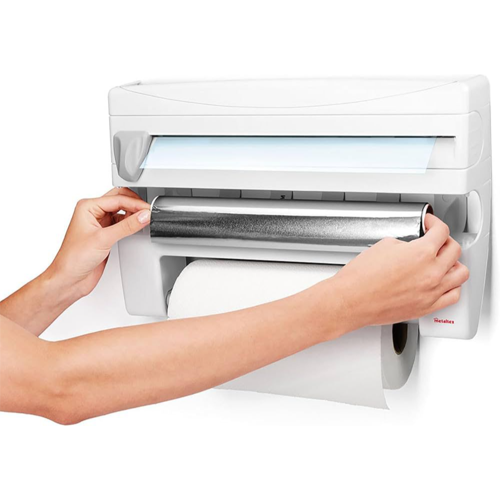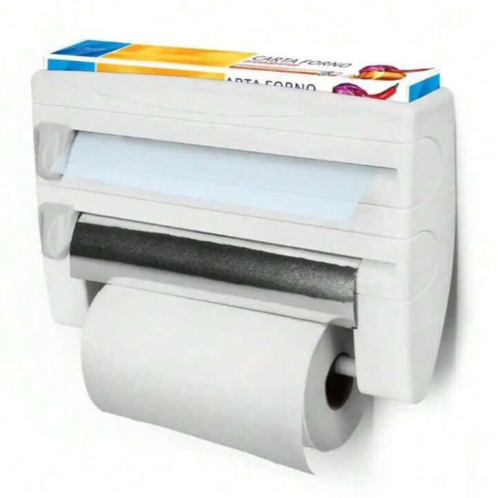 موزع ورق ثلاثي، غلاف بلاستيكي، ورق ألومنيوم، ولفائف مطبخ حامل لفات لـ 3 لفات مع شفرتين قطع للألمنيوم والفيلم الشفاف...