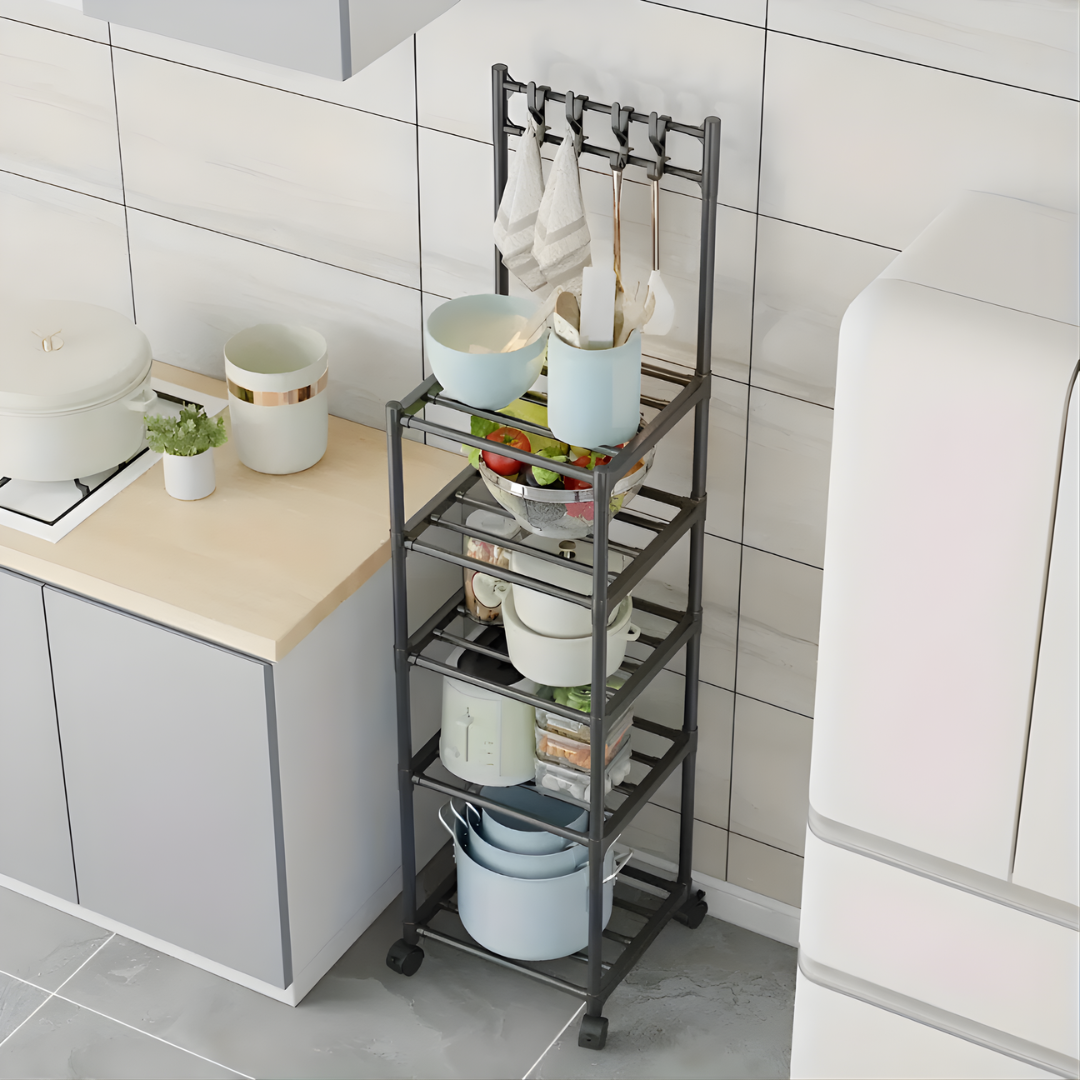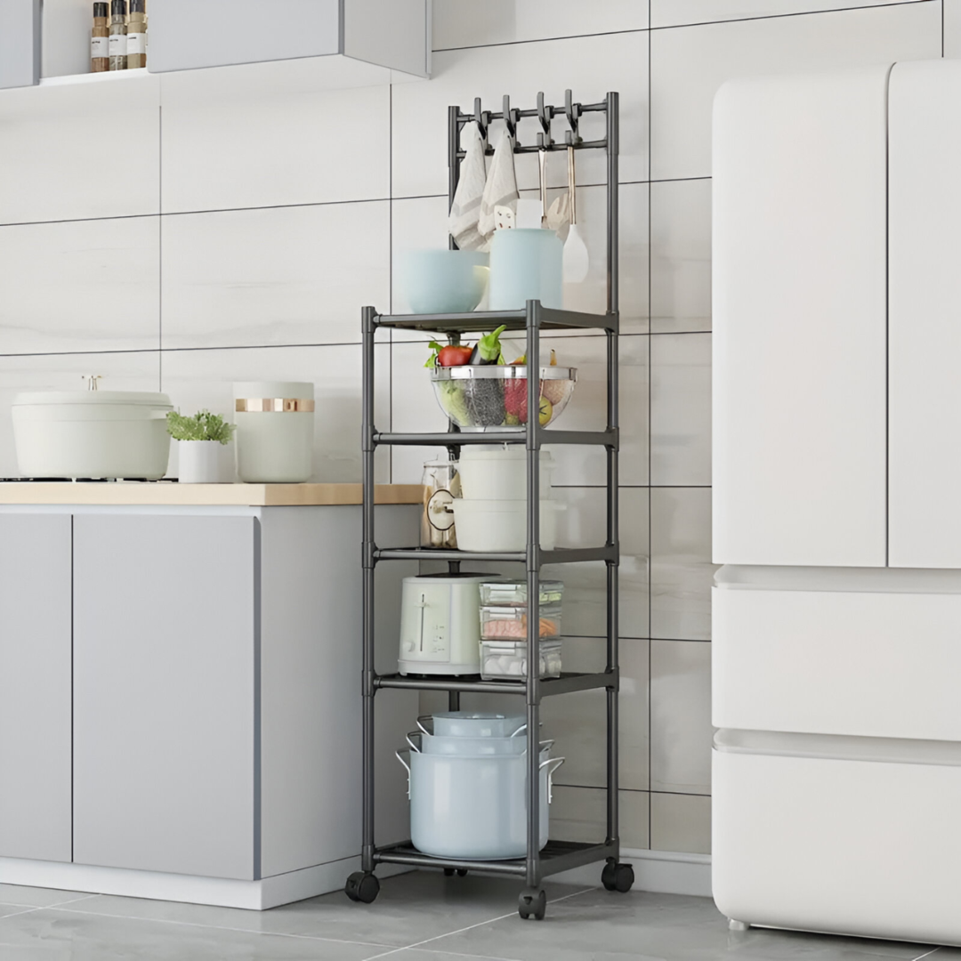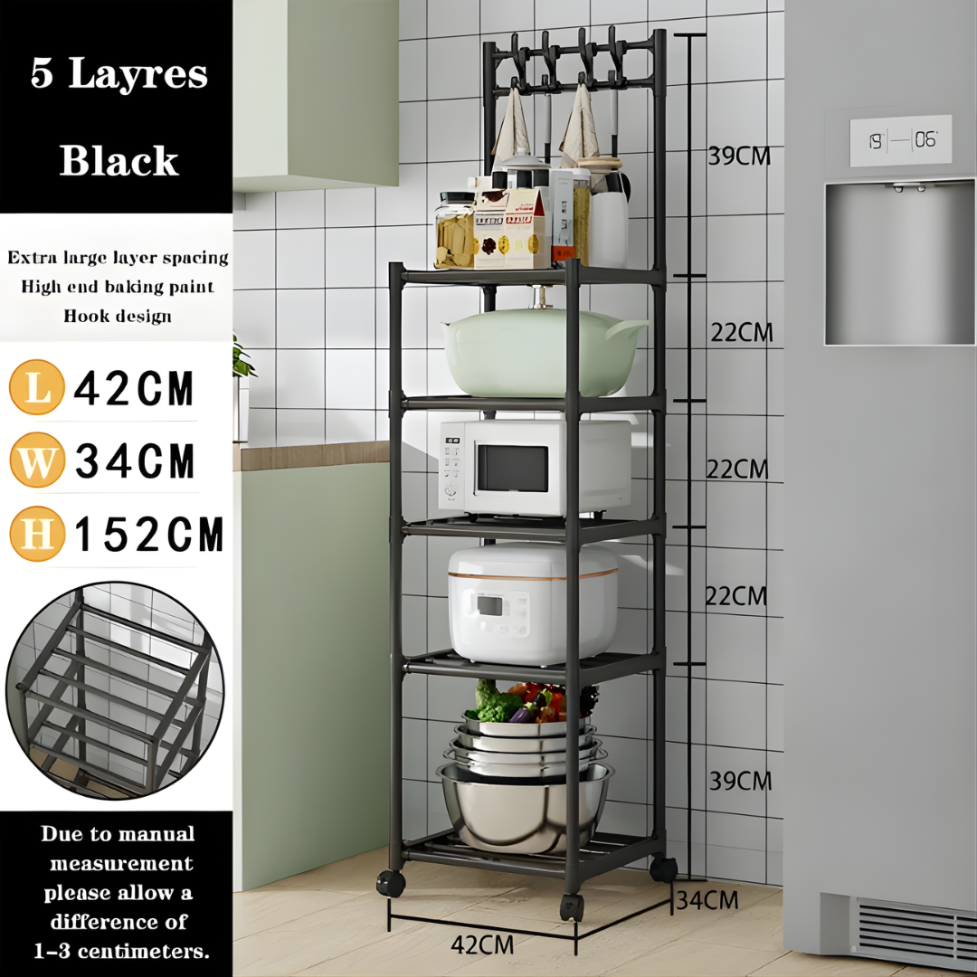 رف متحرك متعدد الأغراض بخمس طبقات للمطبخ المنزلي، رف تخزين معدني متعدد الأغراض مزود بعجلات