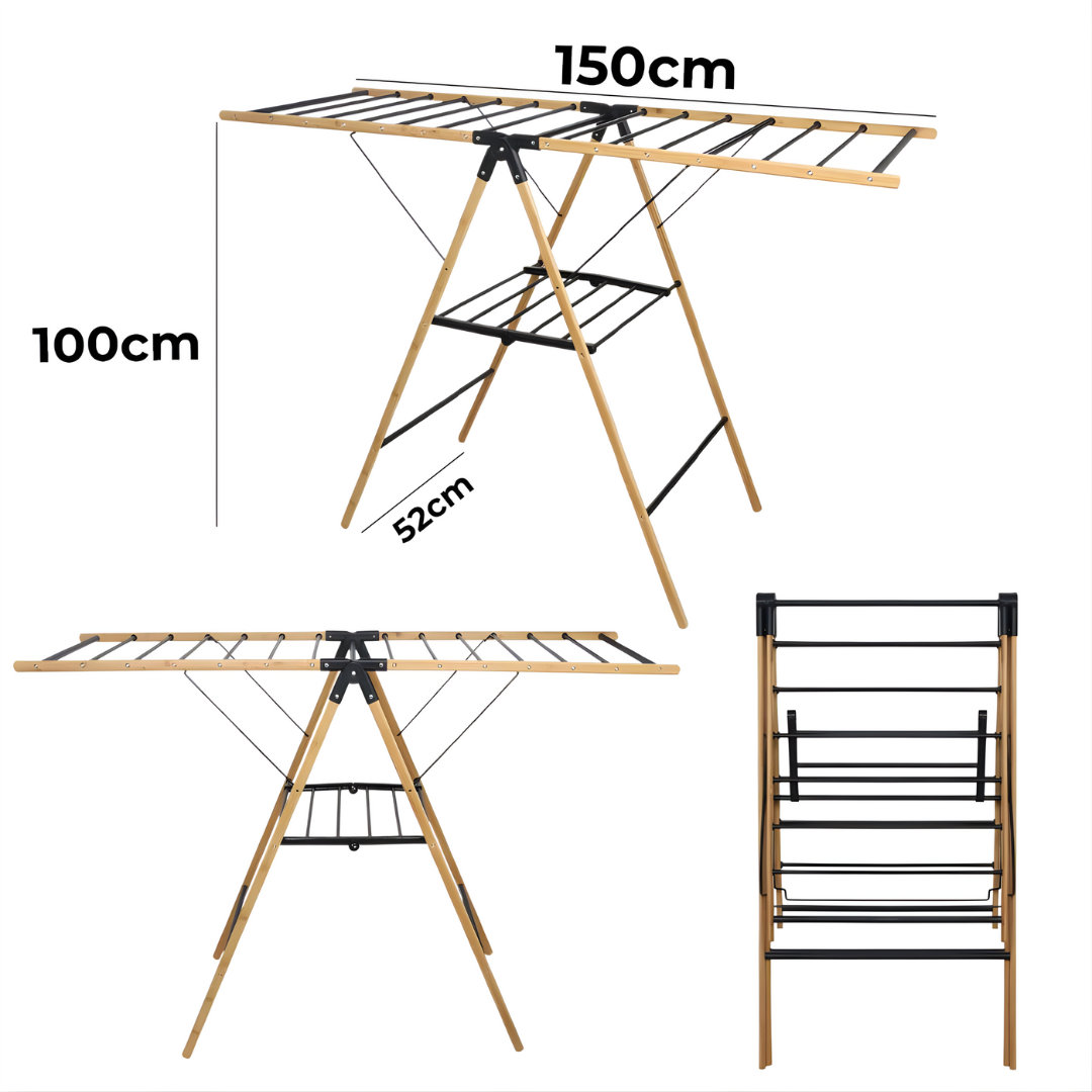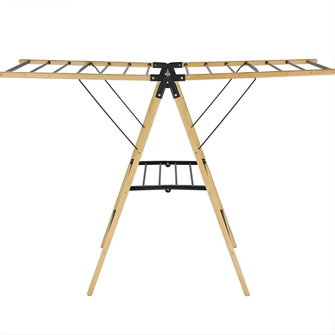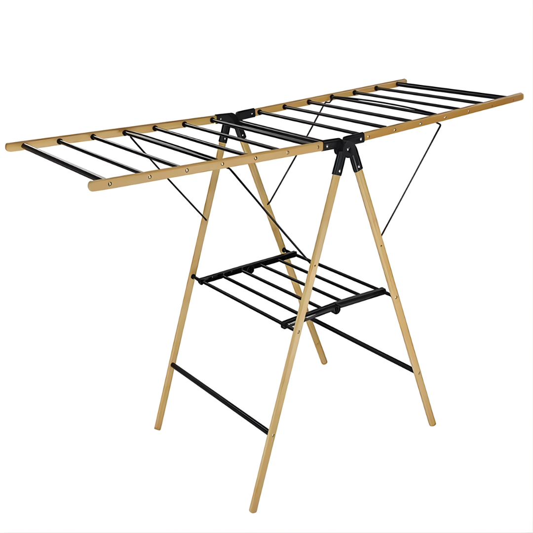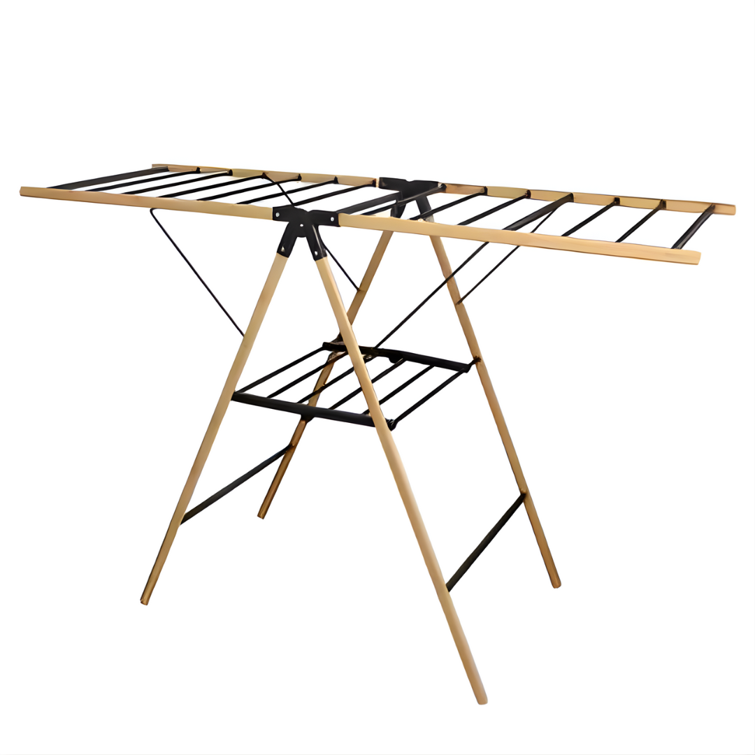 This clothes drying stand combines the classic appeal of wood with modern functionality. The wooden frame provides stability while keeping the overall weight manageable, and the aluminum rods offer reliable support for wet garments. When expanded, it offers multiple levels for hanging various types of clothing, and its collapsible nature makes it ideal for homes with limited storage space. The natural wood finish adds an aesthetic touch that makes it suitable for visible areas in the home.