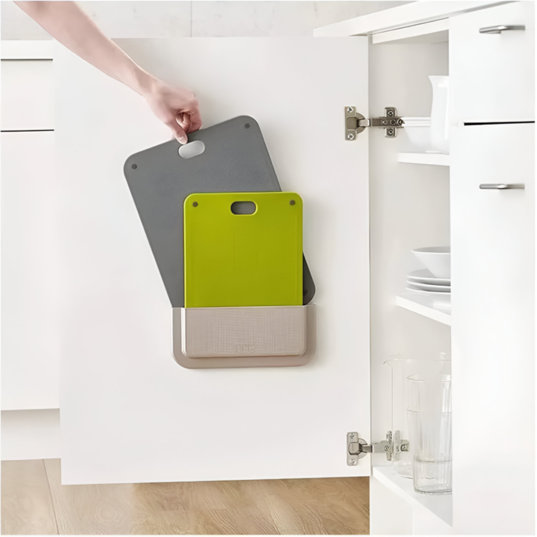 مجموعة لوح تقطيع مكونة من قطعتين مع حقيبة تخزين داخل الخزانة.