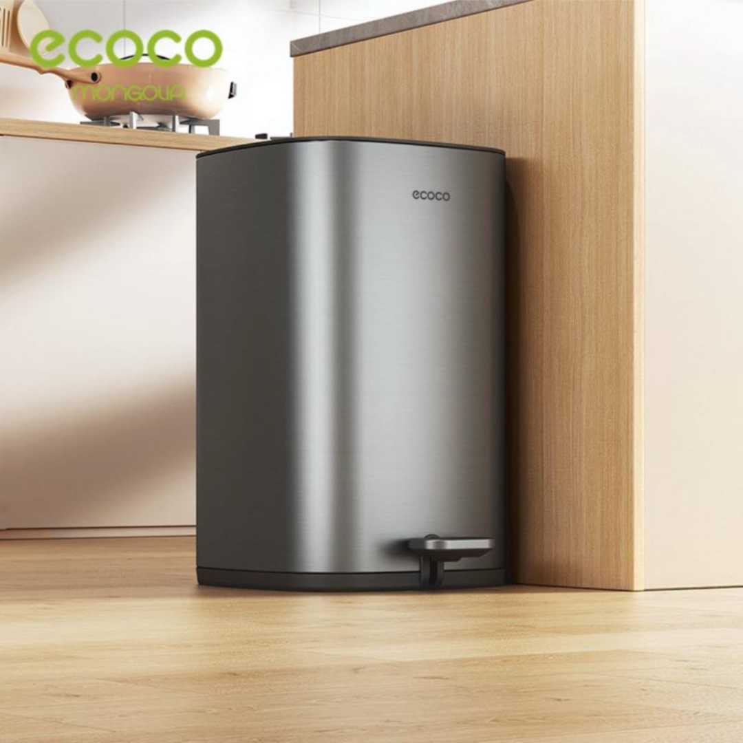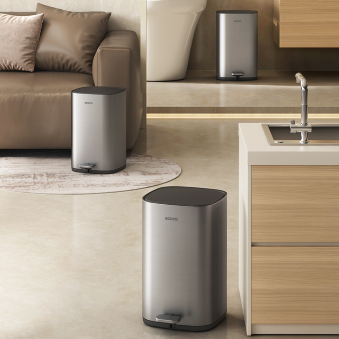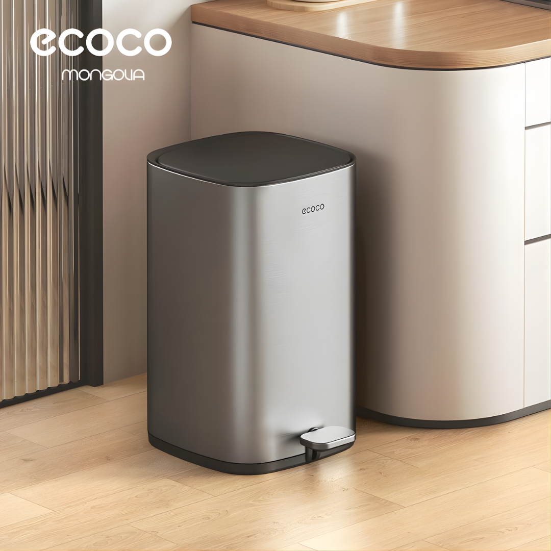 The Ecoco Stainless Steel Pedal Trash Can features a minimalist design with clean lines and a brushed stainless steel finish that resists fingerprints and smudges. The squared shape allows it to fit neatly against walls or in corners, maximizing space efficiency. The black pedal and base provide a striking contrast against the metallic body while offering stability during operation. The double tank system enables convenient waste separation, making it an environmentally conscious choice for modern households. The lid closes smoothly and quietly, helping to contain odors while maintaining a sleek appearance in any room.