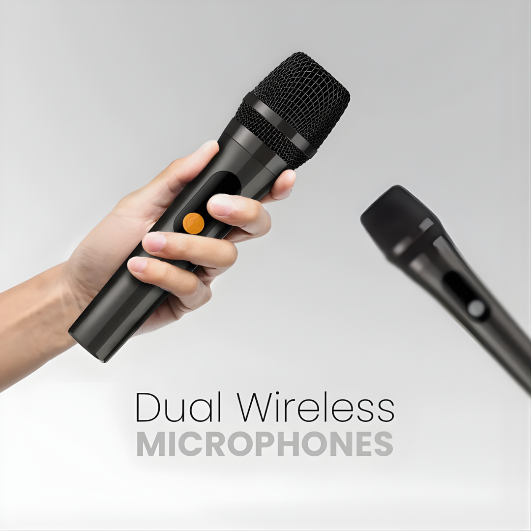 Karaoke Ready: Sing along with dual wireless mics, ideal for karaoke sessions with friends and family. Manage music, volume, and lighting from a distance with the included remote control and strap.