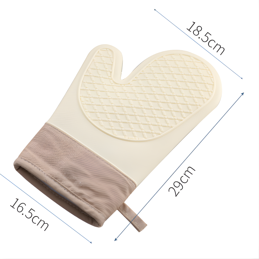 The gloves feature a beige and brown two-tone design with a textured silicone pattern on the palm side for enhanced grip. The flexible construction allows for natural hand movement while maintaining protection from hot surfaces. Perfect for handling pots, pans, baking sheets, and other hot cookware. The easy-to-clean surface ensures long-lasting use and maintains hygiene in the kitchen.