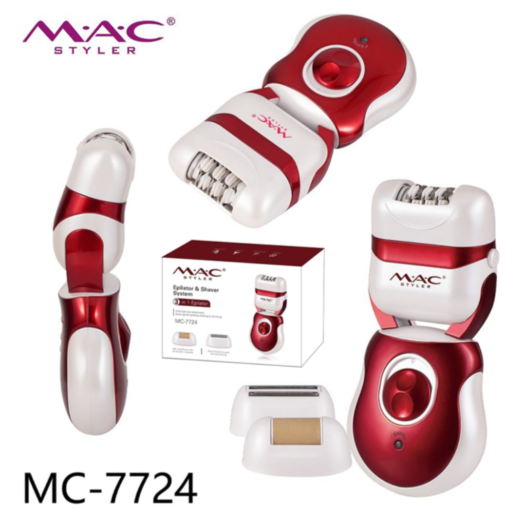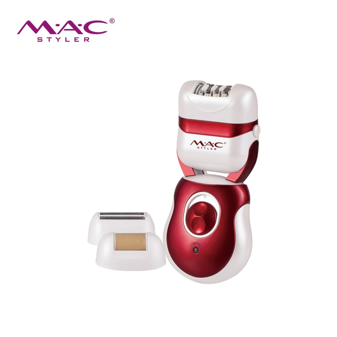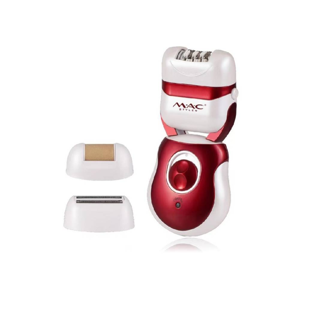 The Mac Styler 3-in-1 Epilator and Shaver System is a versatile grooming device featuring multiple attachments for complete hair removal and foot care. This rechargeable unit combines epilating, shaving, and foot smoothing functions in one ergonomic tool with a distinctive red and white design.