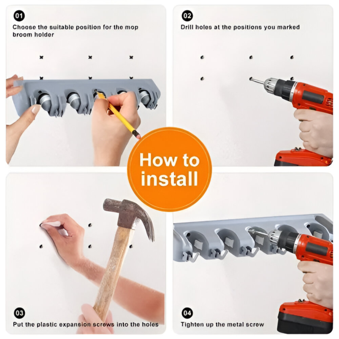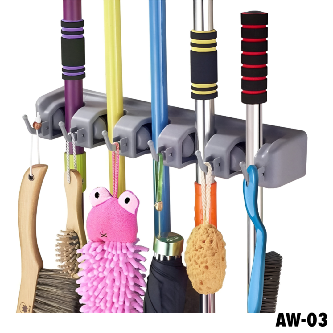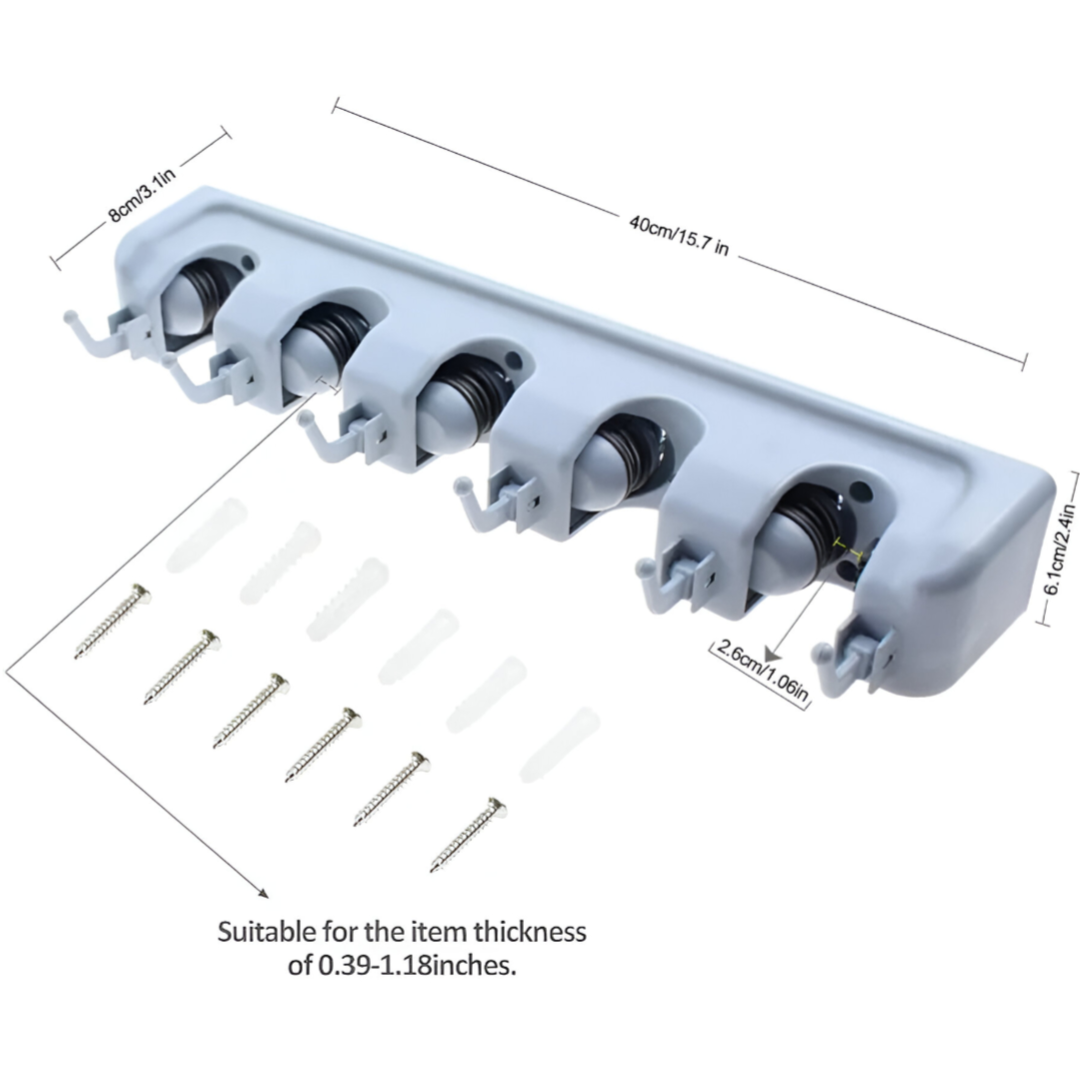 حامل ممسحة ومكانس مثبتان على الحائط - مع خطافات لتنظيم الحمام والمطبخ