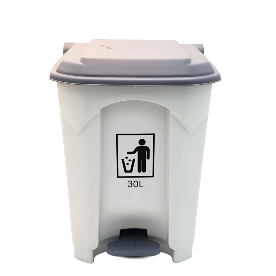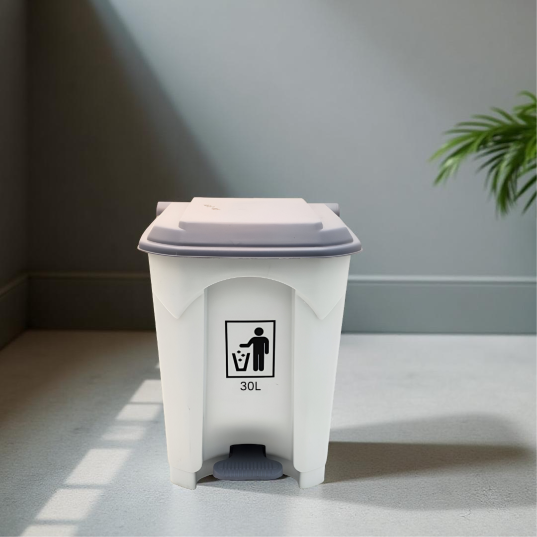 This is a 30 Liter pedal-operated trash bin, designed for hygienic and convenient waste disposal. Made from durable plastic, it features a sturdy foot pedal that allows hands-free opening of the lid, promoting cleanliness and reducing contact with germs. The bin comes in a sleek design with a grey lid and white body, making it suitable for use in kitchens, offices, bathrooms, and other indoor spaces. Its compact yet spacious 30-liter capacity provides an ideal balance between size and functionality, perfect for everyday use.