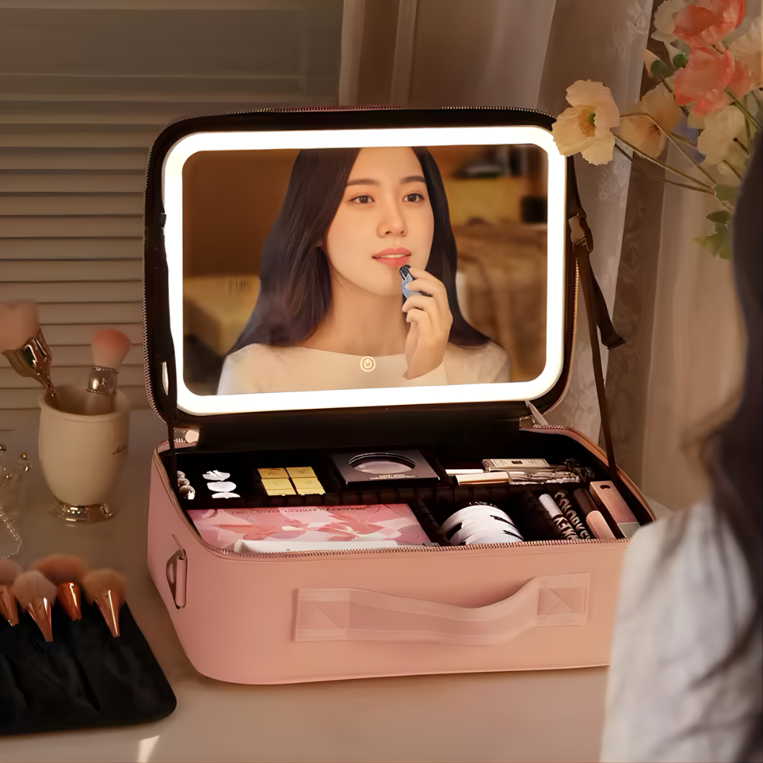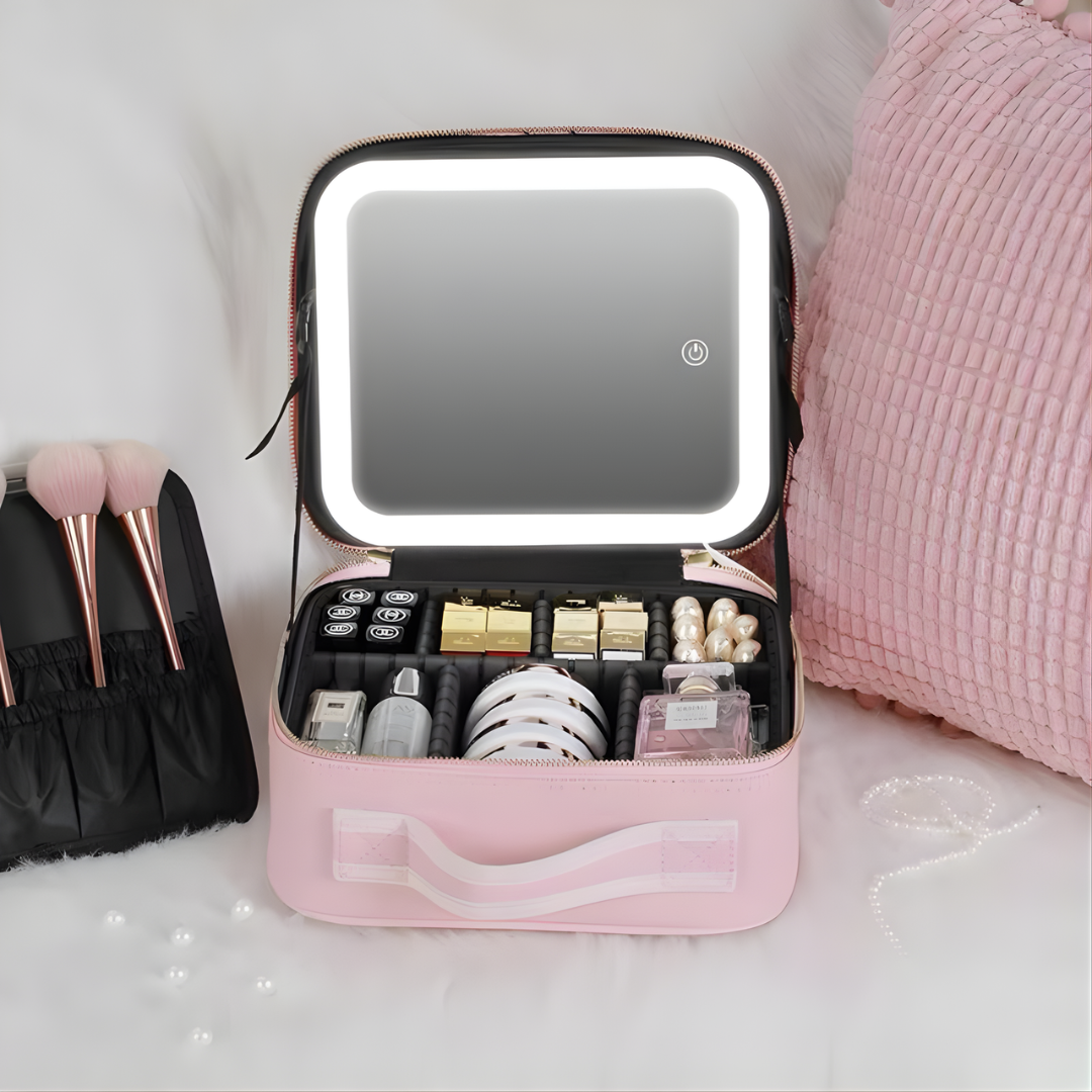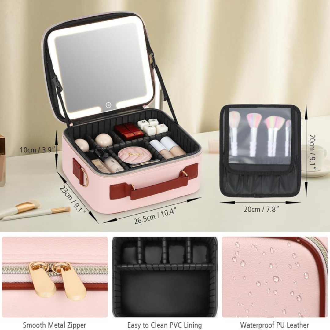 Elevate your beauty routine with this portable travel makeup organizer. Discover convenience and style in one package, featuring a lighted mirror and adjustable dividers. Crafted from premium leather, this elegant case simplifies your beauty routine whether you're at home or on the go. Perfect for those seeking convenience and flawless beauty.