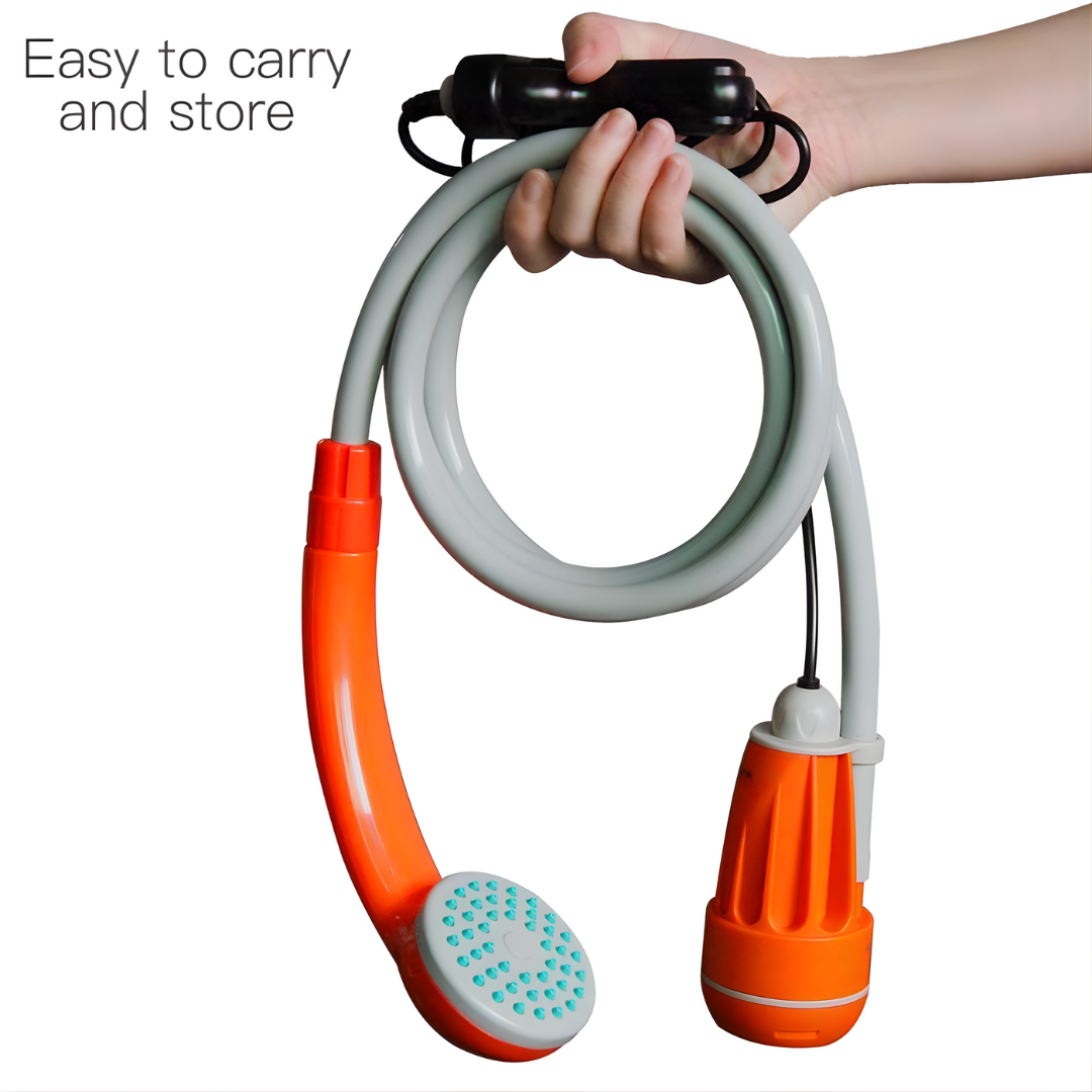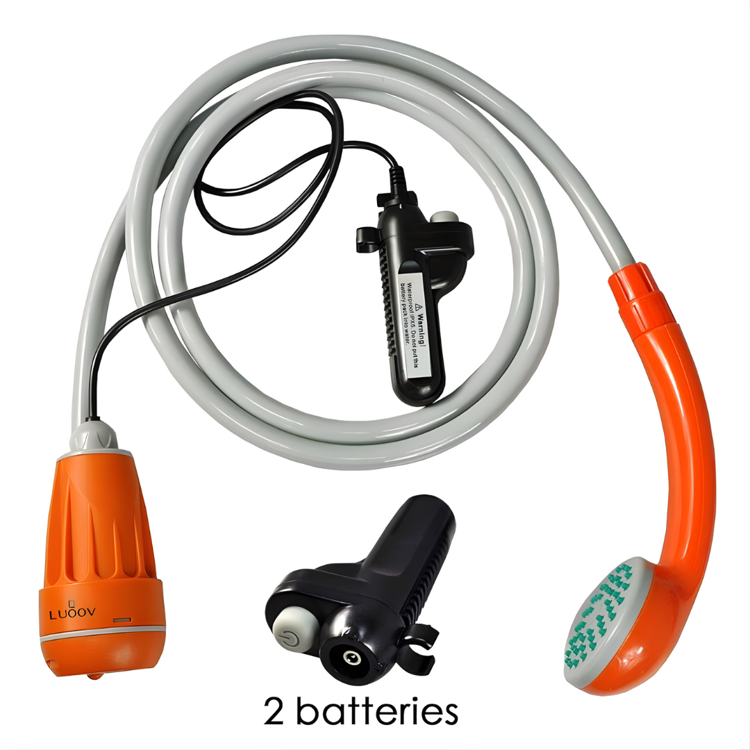 A versatile portable shower system designed for outdoor activities, featuring a rechargeable pump system with dual detachable batteries, flexible hose, and multi-function shower head. Perfect for camping, hiking, and emergency situations where traditional shower facilities aren't available.
