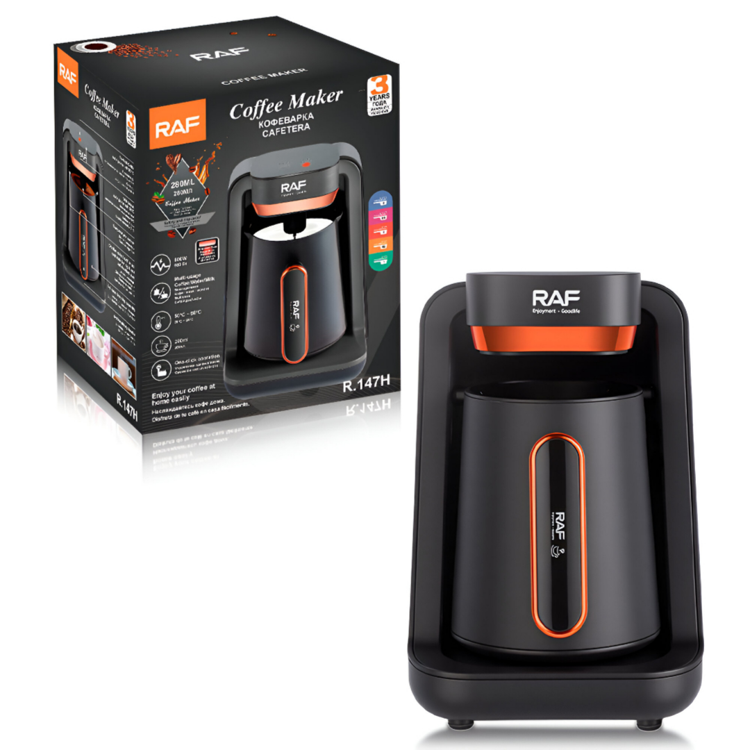 The RAF R.147R is a versatile 500W electric coffee maker featuring a 280ml capacity and one-click operation system. This modern appliance offers multi-usage functionality for coffee, water, and milk preparation, with temperature control ranging from 50°C to 98°C and anti-overflow protection.