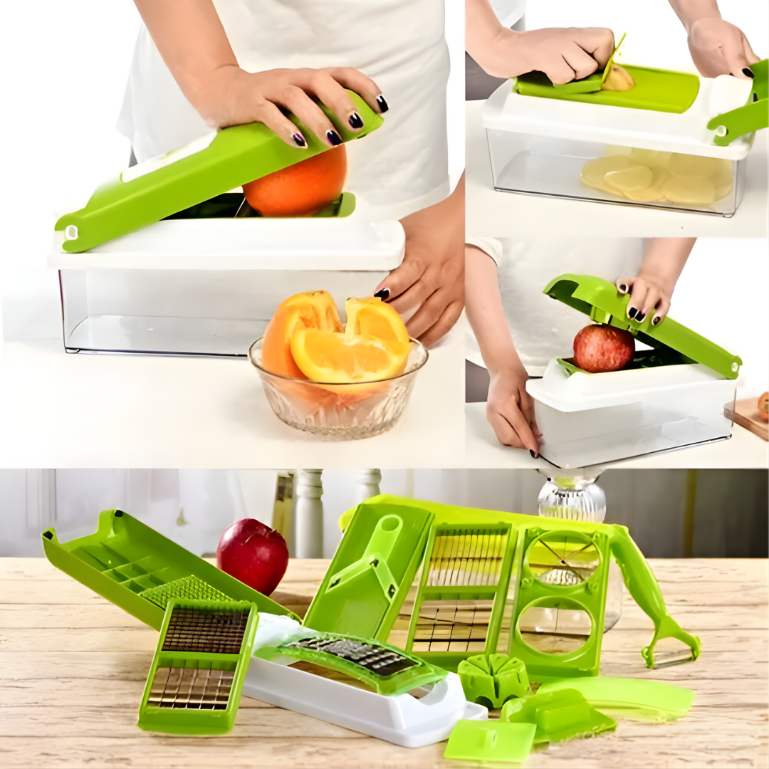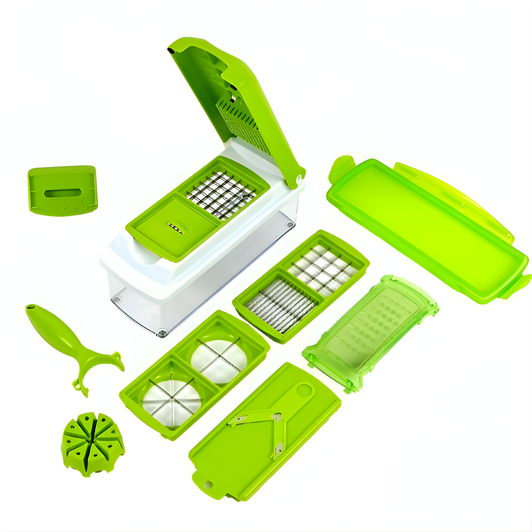 The Vegetable and Fruit Chopper is a versatile kitchen tool featuring multiple interchangeable blades and a durable green plastic construction. This all-in-one food prep station includes various cutting attachments for dicing, slicing, and grating fruits and vegetables with ease.