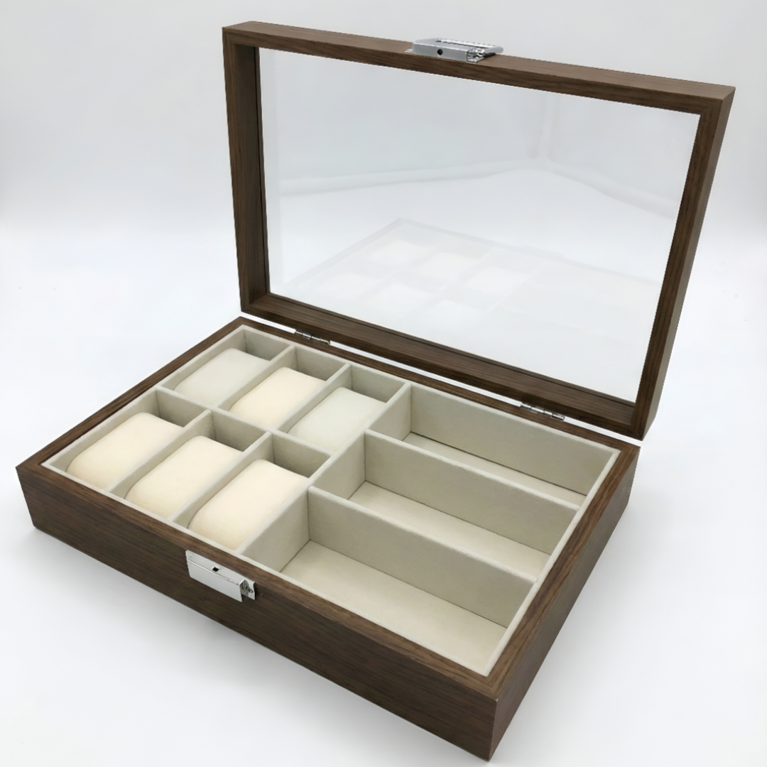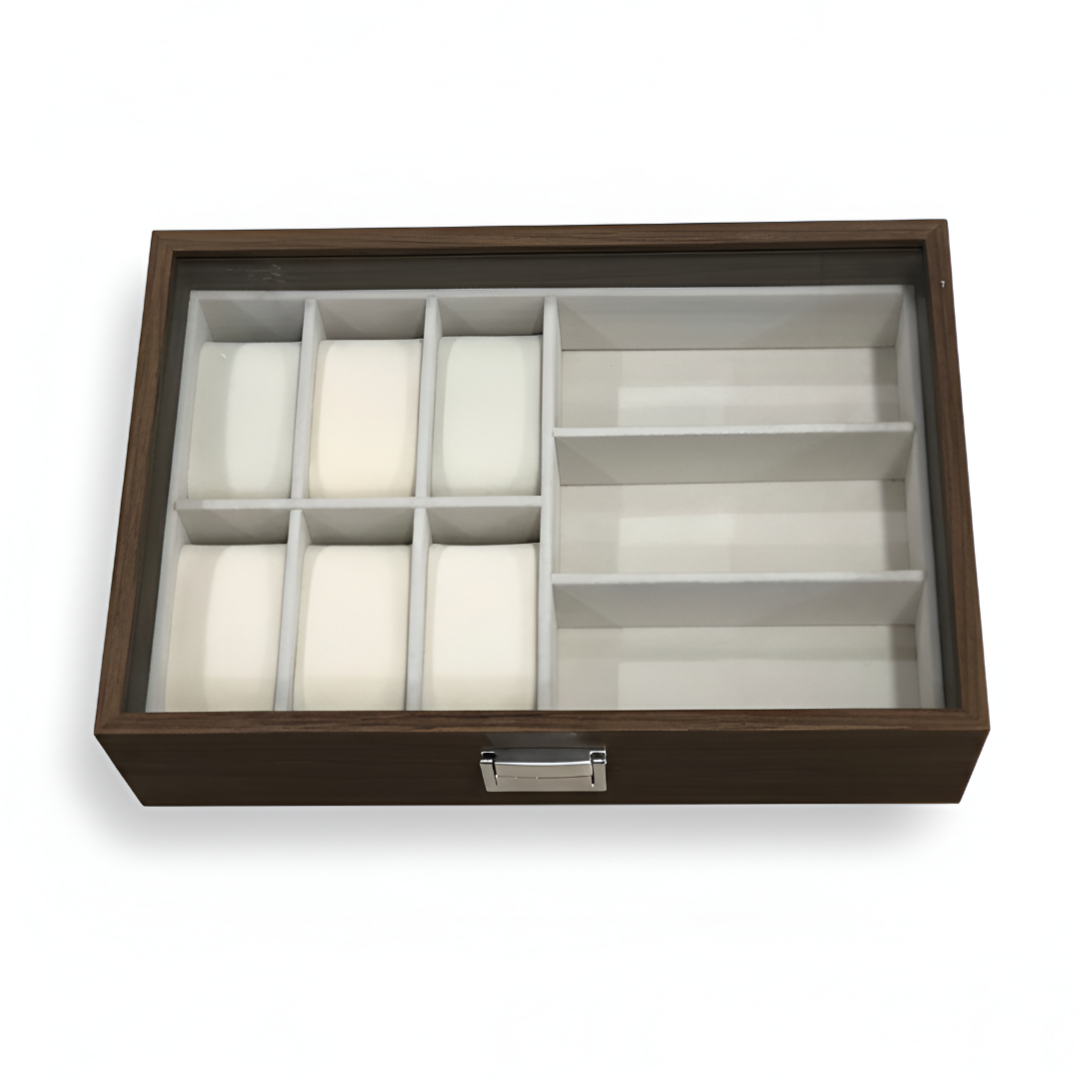 Elevate your organization with this sophisticated 2-in-1 display case, designed to house your most prized accessories. Crafted with a rich, dark wood grain finish and accented with sleek silver hardware, this box is as stylish as the collection it holds.
