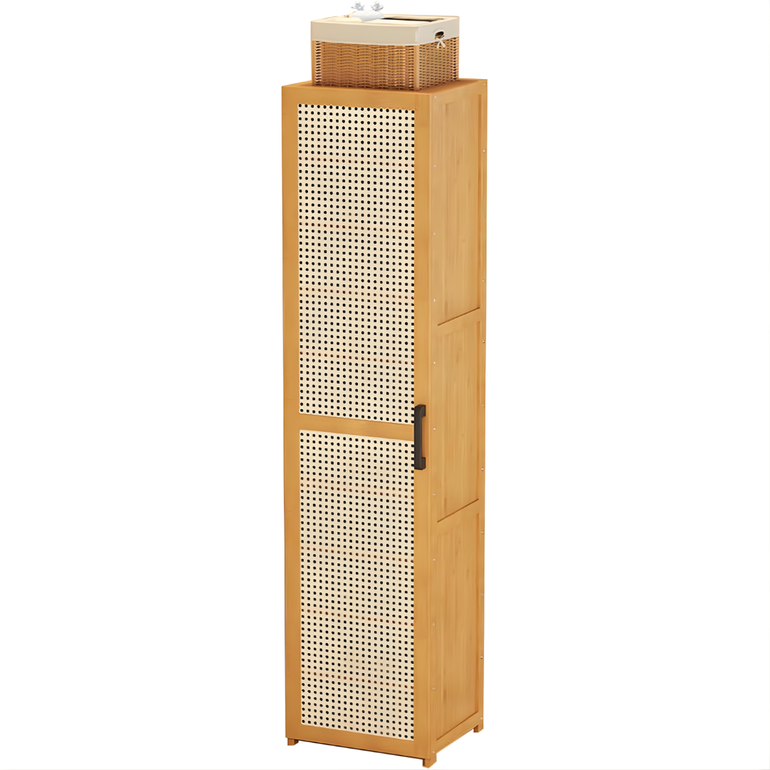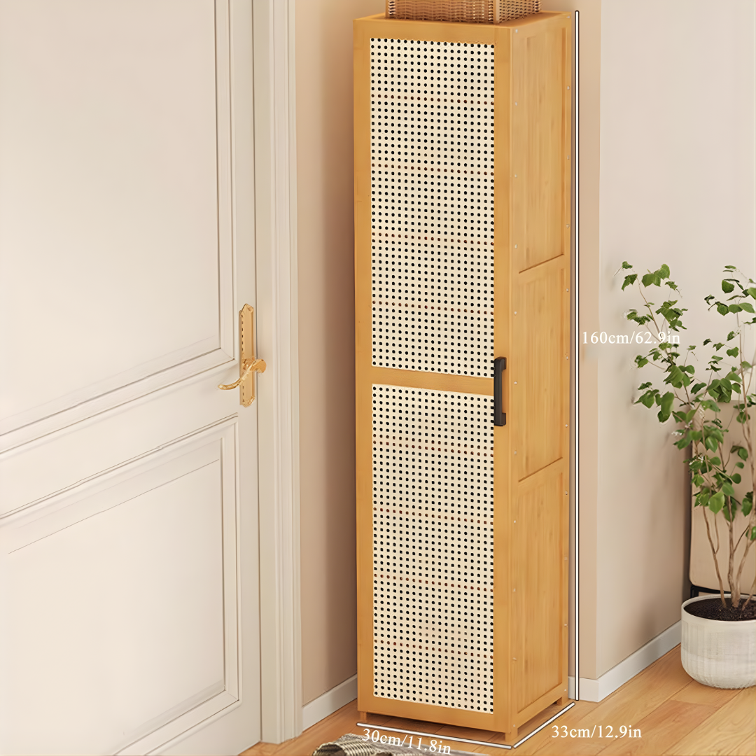 Eco-friendly Material: Narrow and tall shoe cabinet made of bamboo + density board, Natural environmental protection, solid and durability. Plastic rattan cabinet doors, hydraulic hinges, mute opening and closing, flexible and smooth. Backboard design, comprehensive dust and moisture-proof.