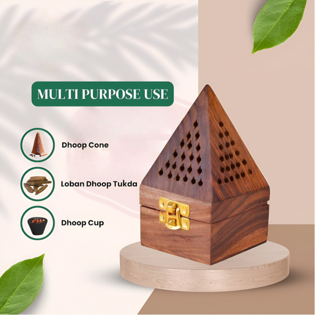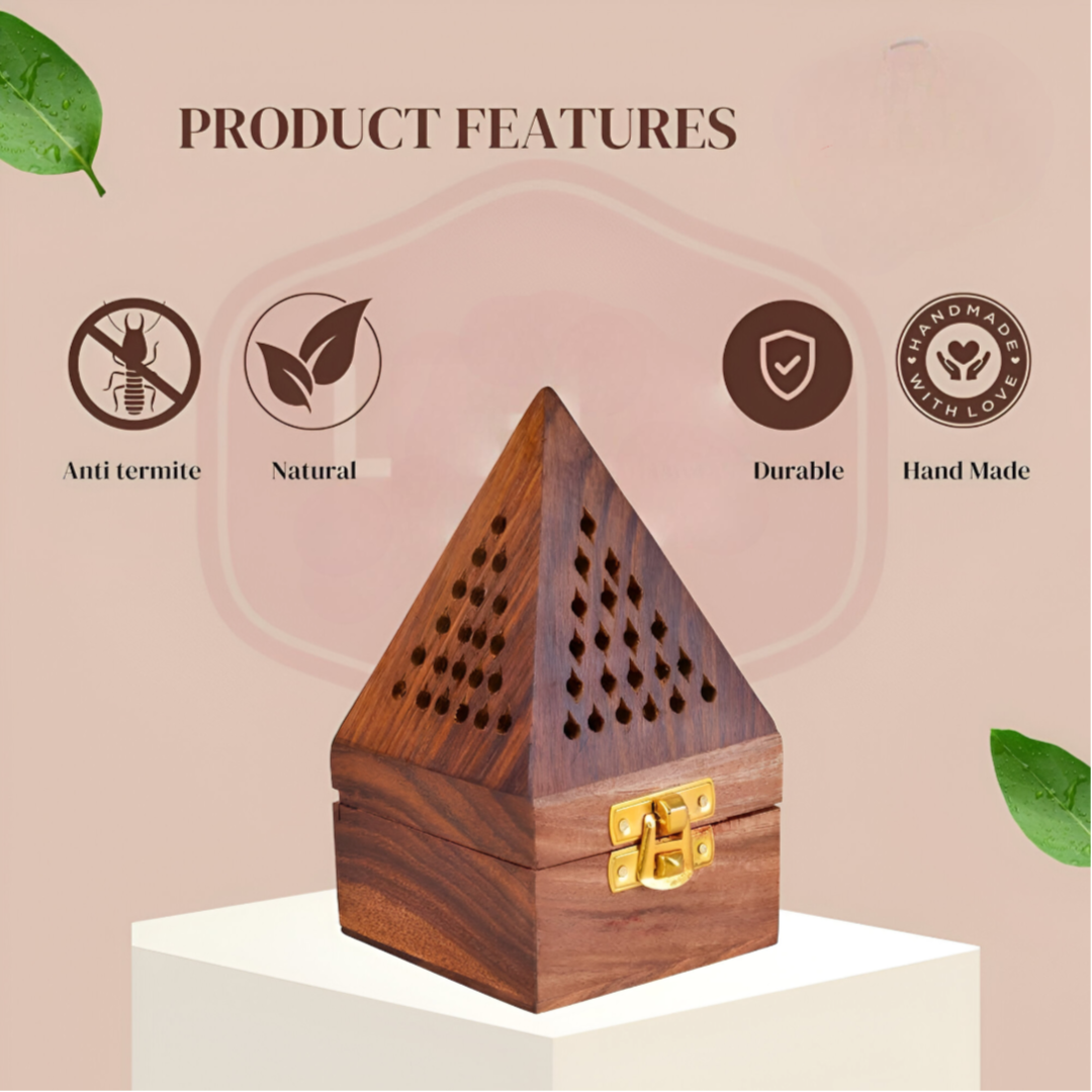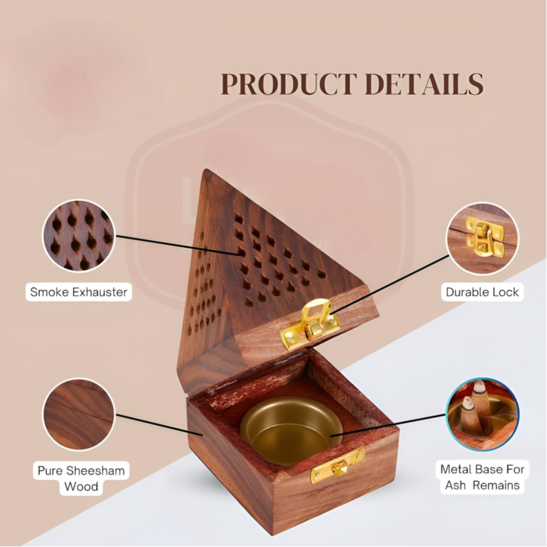 [MATERIAL]: Sheesham wood is long-lasting and durable and can be a wonderful gift item. Wooden incense burner with a storage compartment & brass inlay work.