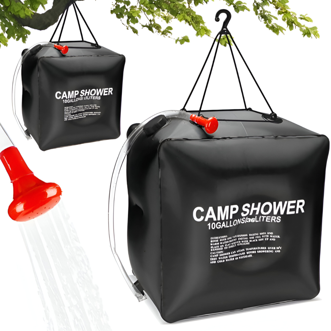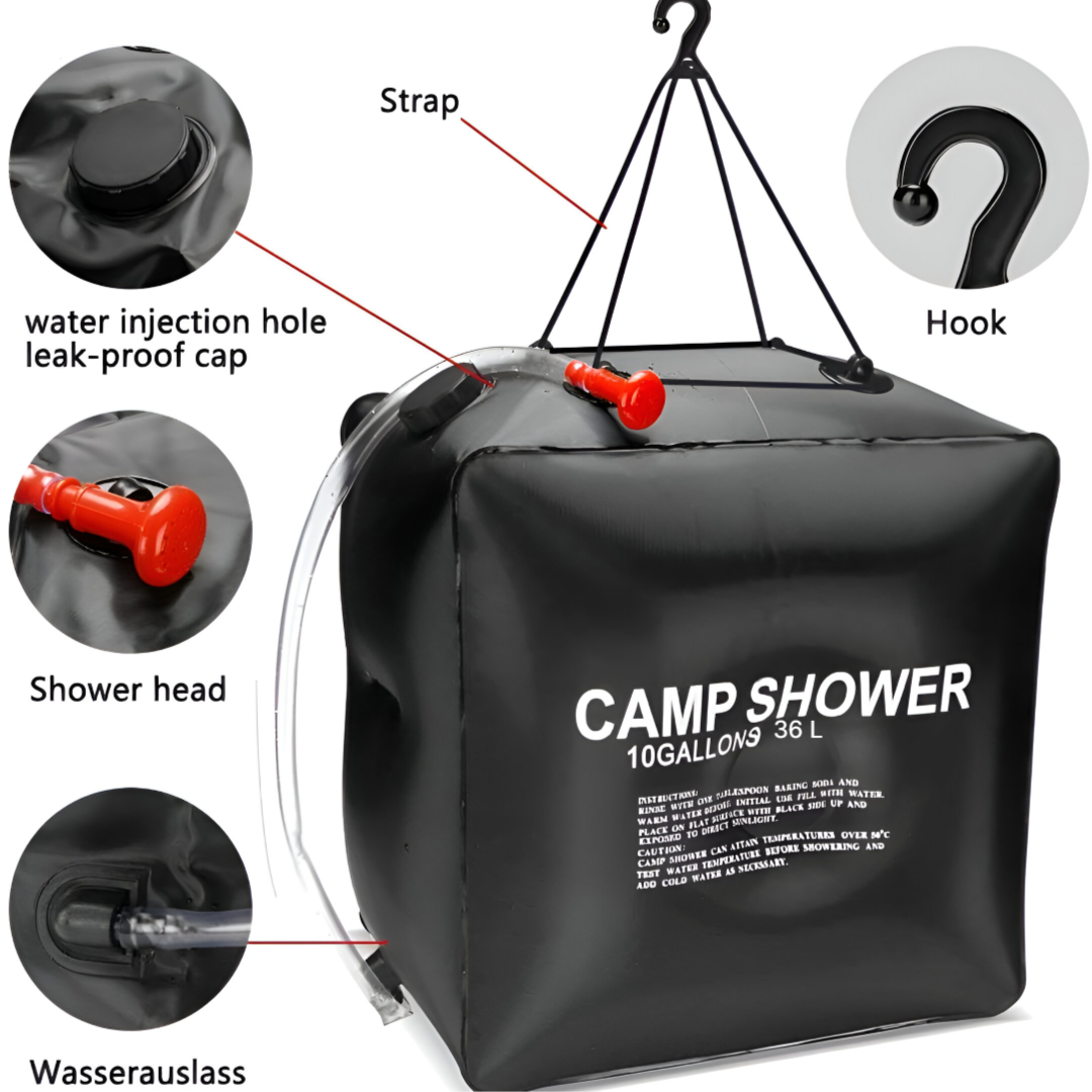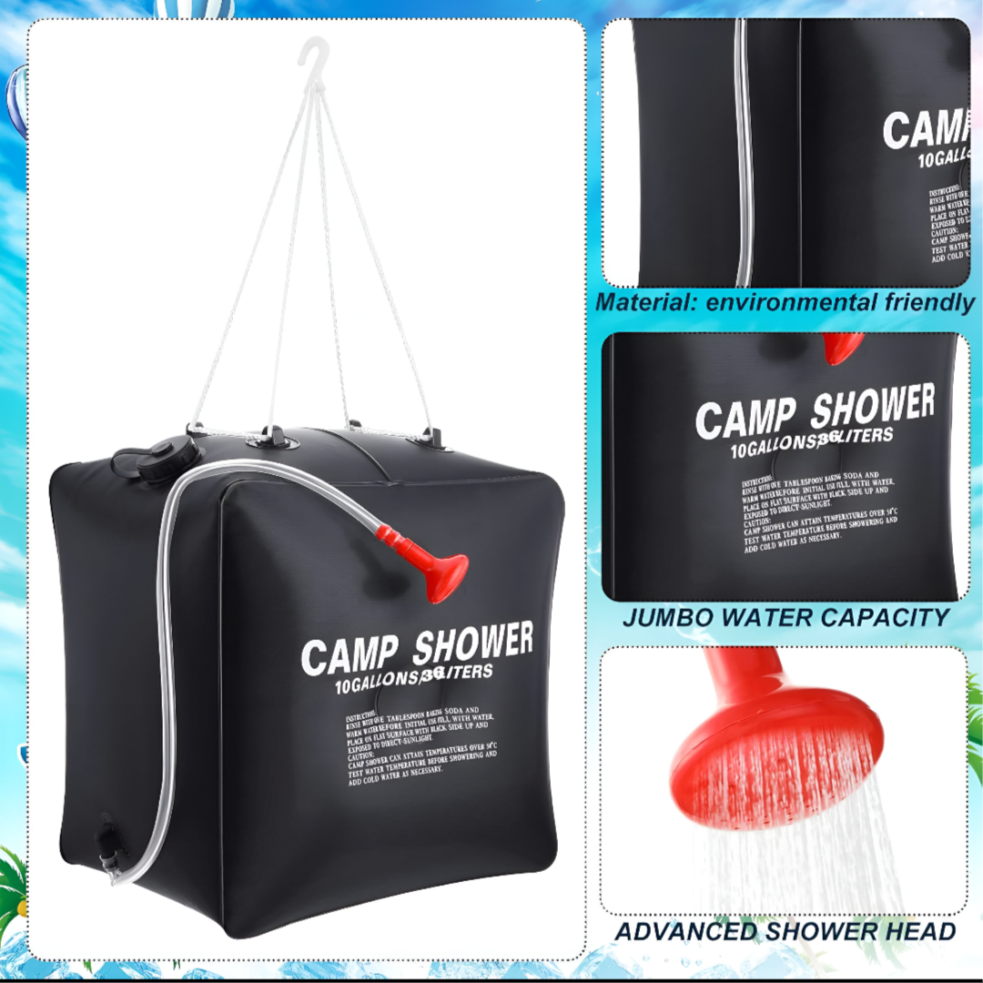 Large Capacity:This solar camping shower has large 10-Gallon/36 Liters water capacity, enough water for multiple showers,The bag itself will not leak, and the faucet can be tightened by itself. The water outlet at the top should be plugged tightly to prevent leakage