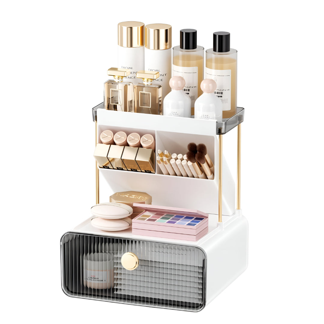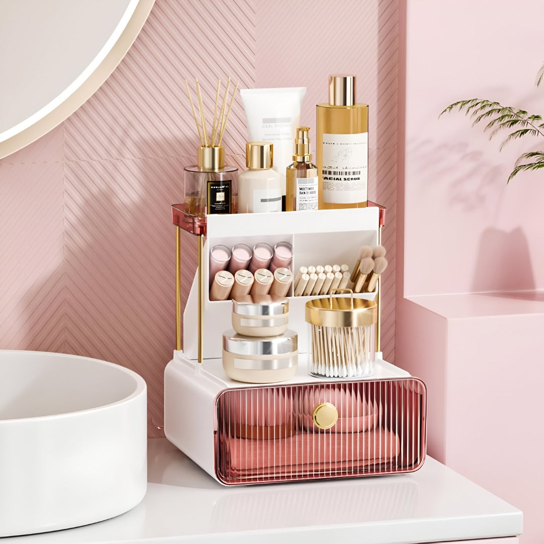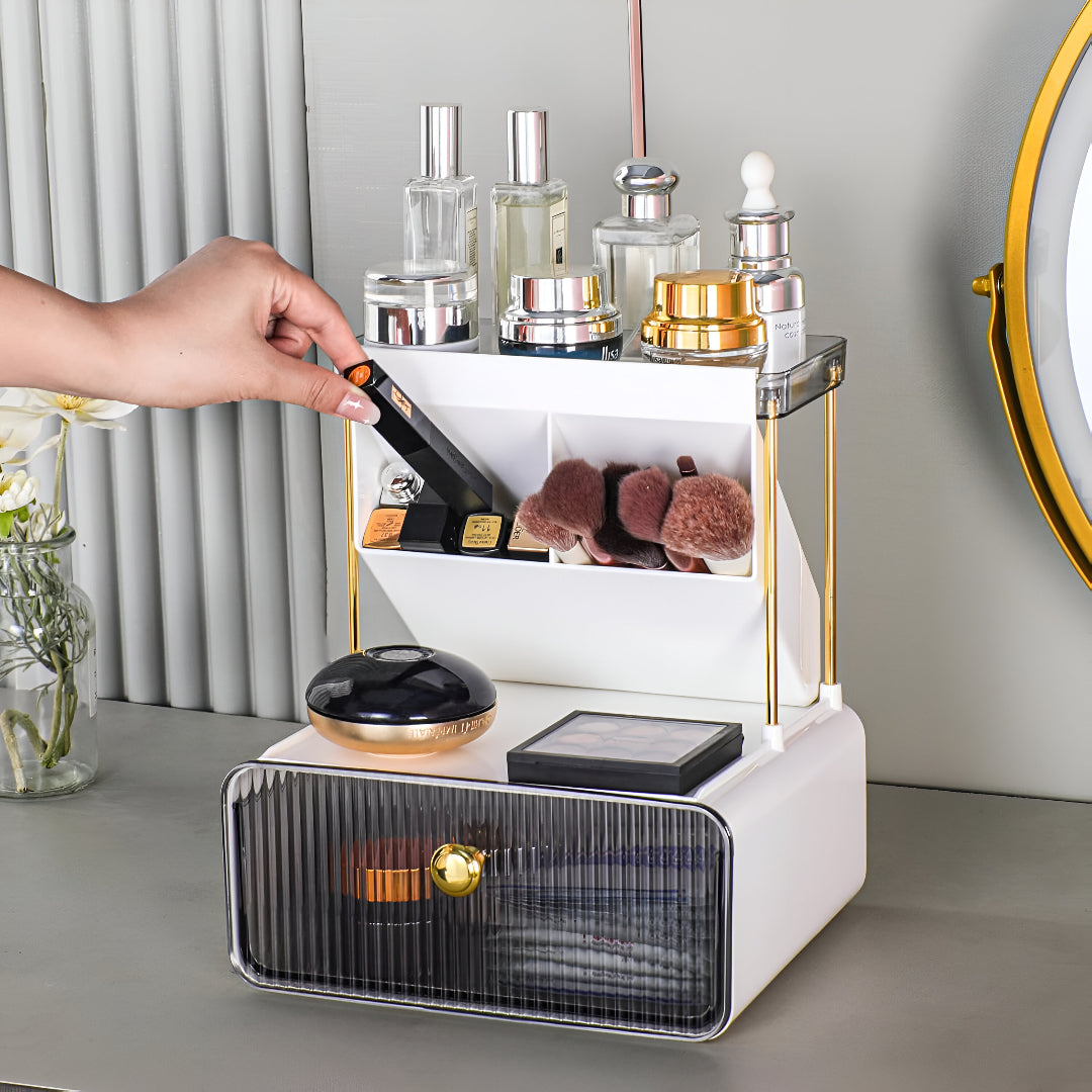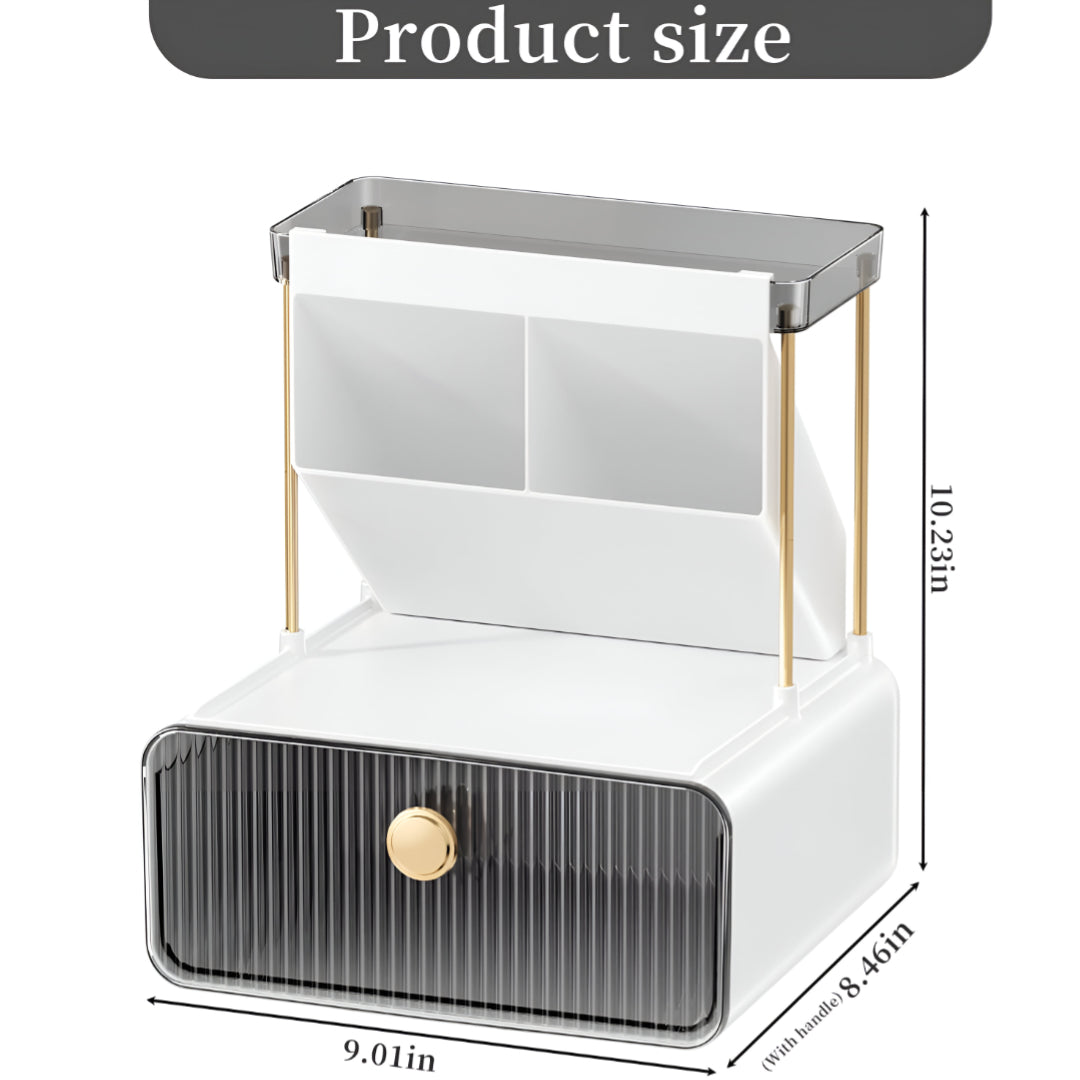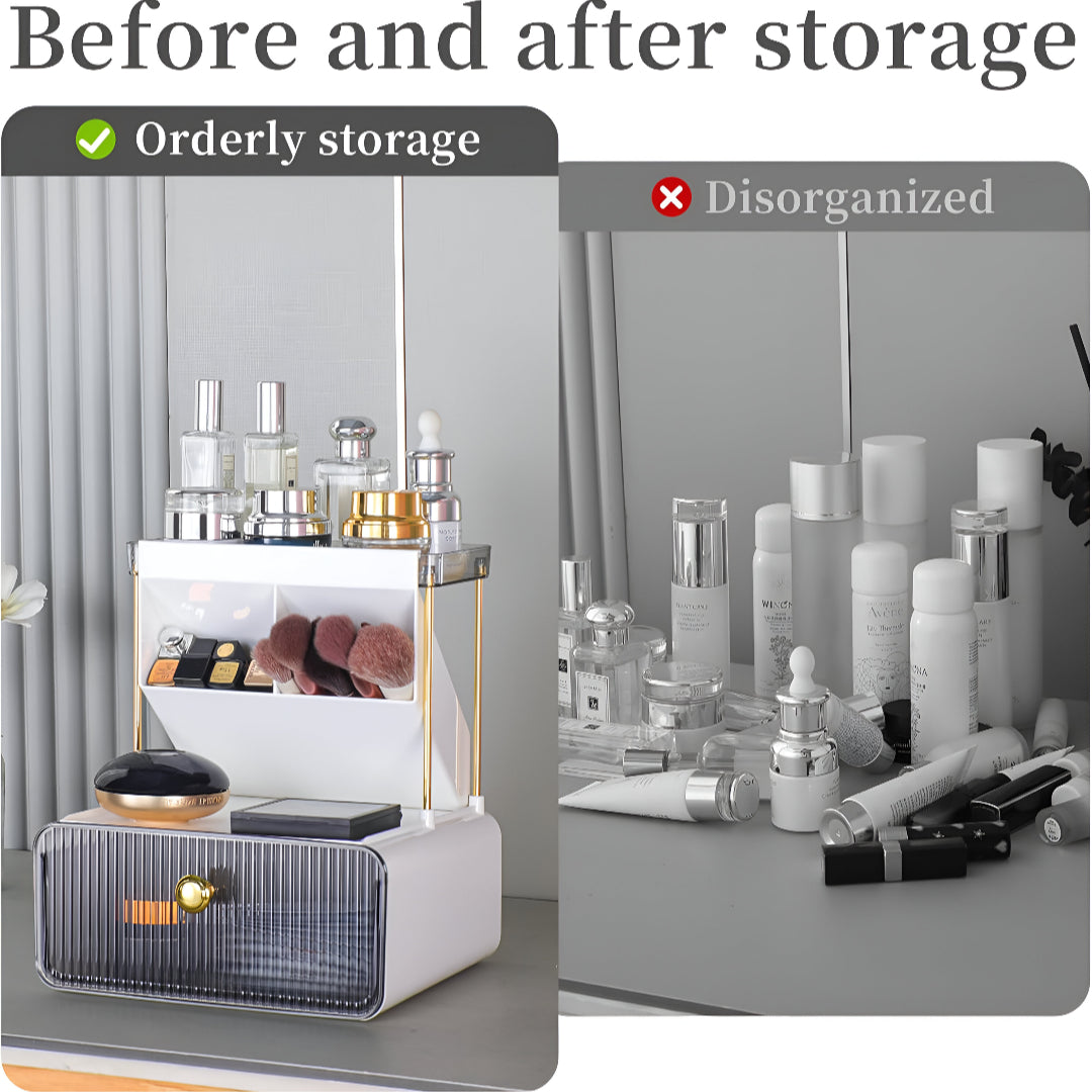 Double-Layer,Large Capacity Makeup Organizer - This 2-tier bathroom organizer countertop with a drawer provides 2-tier storage space, ideal for organizing makeup, toiletries, skincare products, and perfume. Keep your space tidy and clutter-free with this bathroom counter organizer, perfect for any vanity countertop