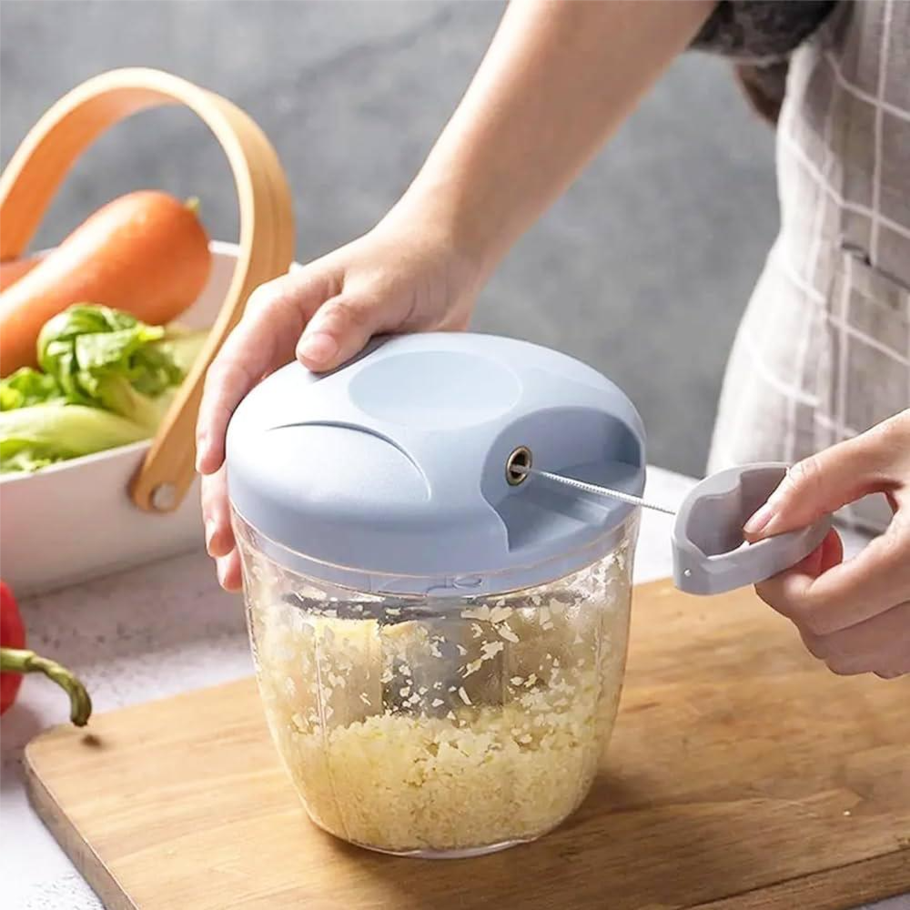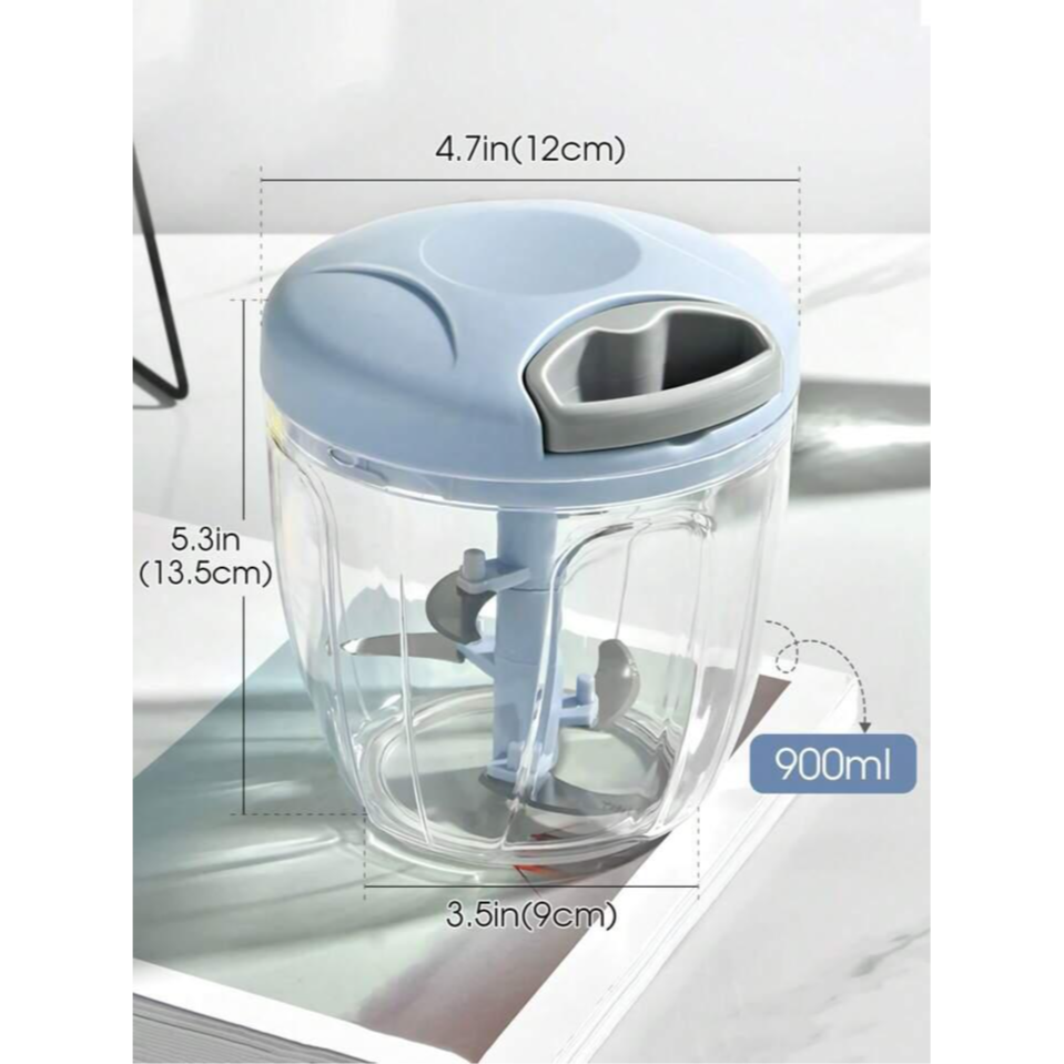 Specifications and dimensions: the onion chopper manual with pulley has a capacity of 900 ml and comes with 5 sharp stainless steel blades. This vegetable cutter requires no electricity and is not bound to time and place, so you can enjoy the joy of cooking.