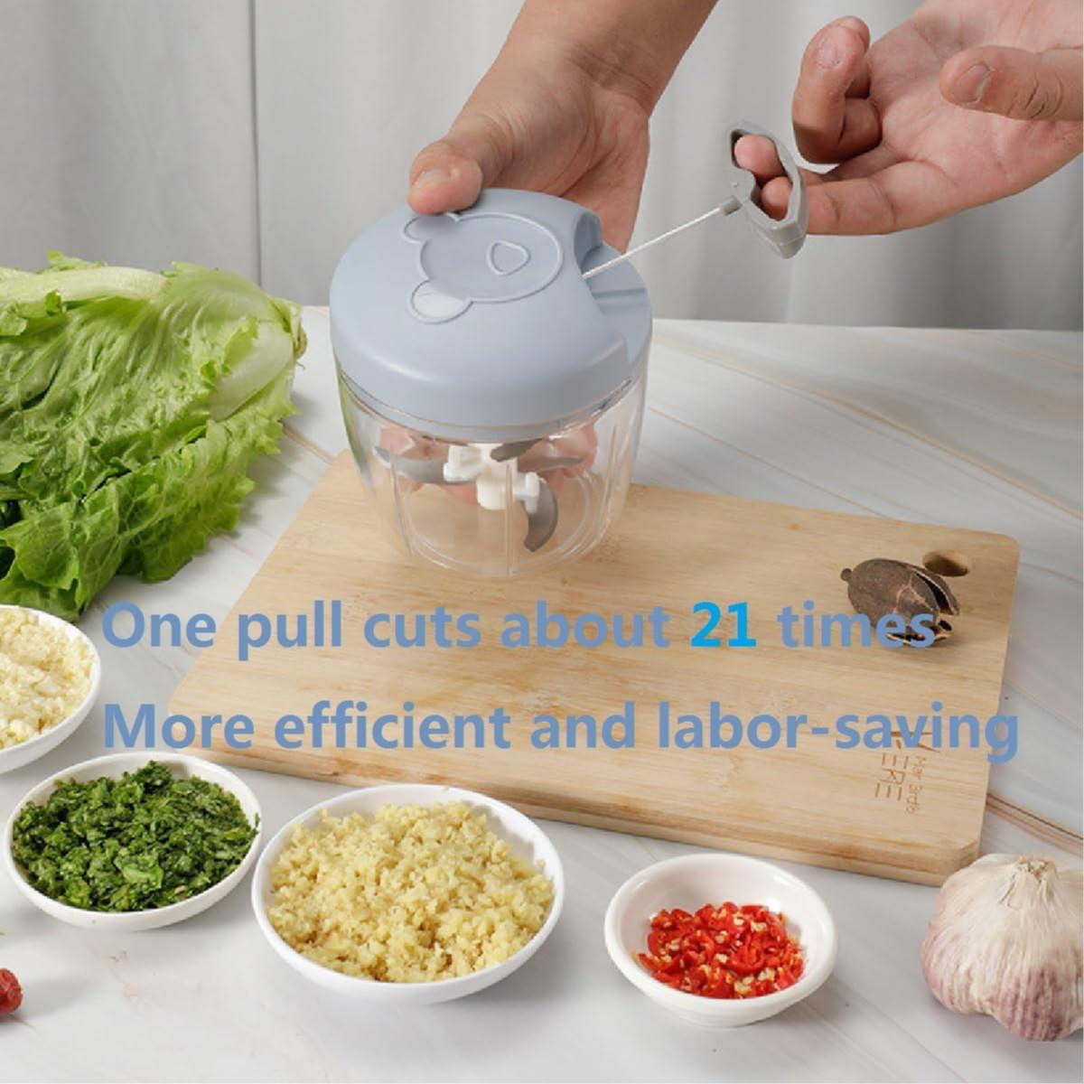 Easy to use: the multi-chopper with 5 stainless steel blades can help you chop food quickly. The more you pull the rope, the finer the food and the transparent bowl allows us to see the food inside.