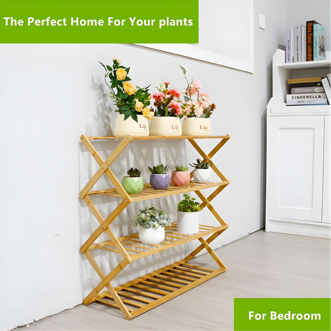 Space saving: 4 tier folding bamboo shelf can work as a plant stand, shoes, bathroom organizer and many other uses, provides more choice and convenience with a small space
