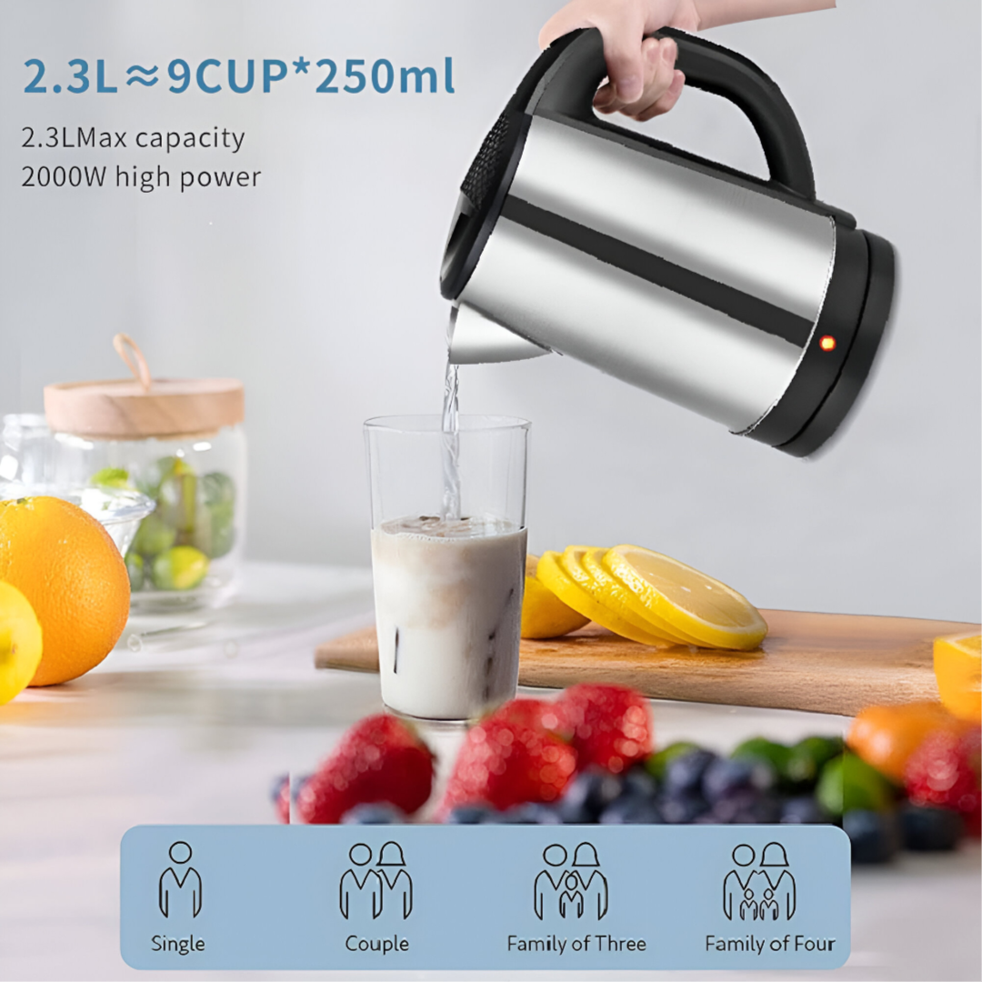 2.3L LARGE CAPACITY:2000W Tea Kettle has a large capacity of 2.3L, which is equal to about 9 cups of 250ml, to meet the drinking water needs of a family or guests' in their daily life.