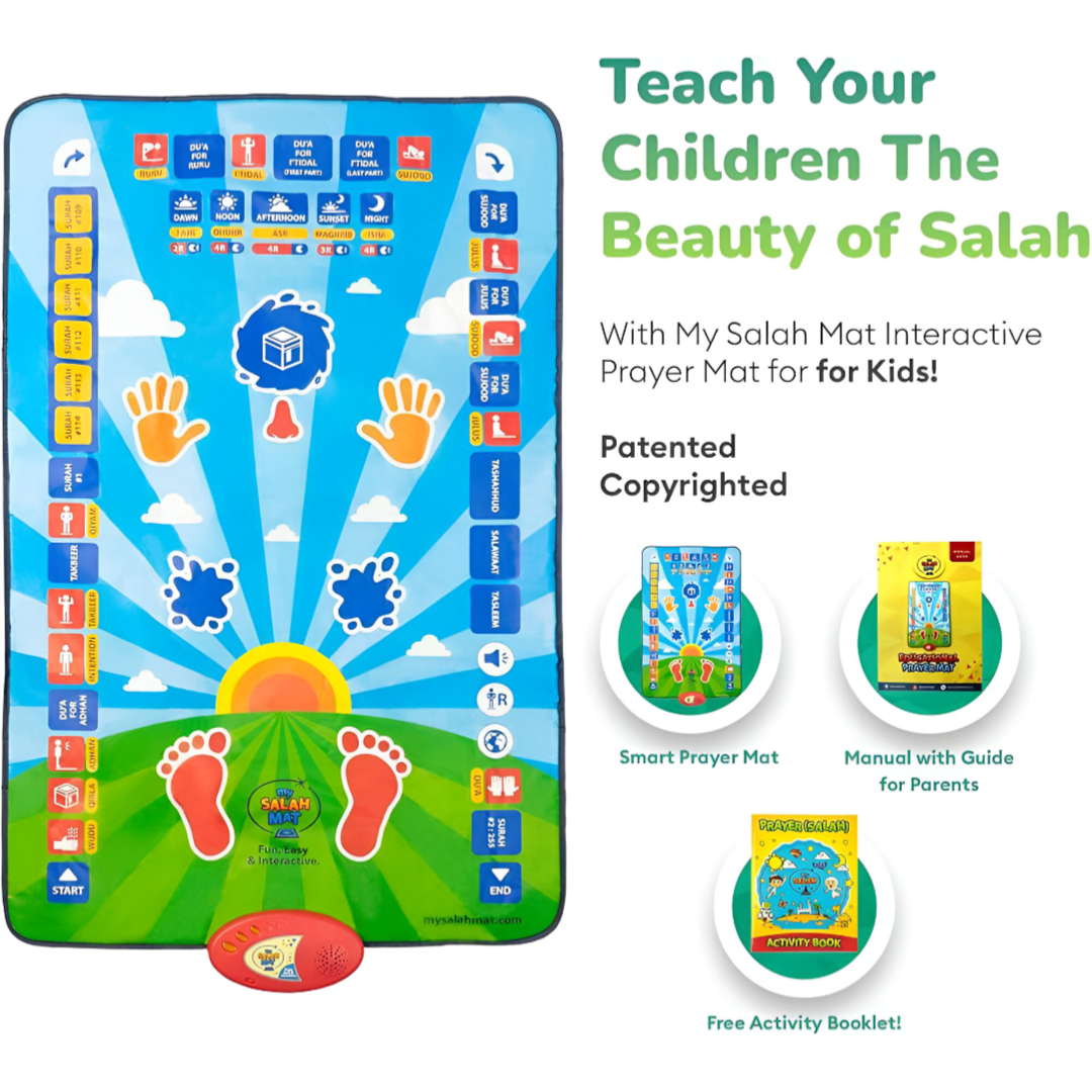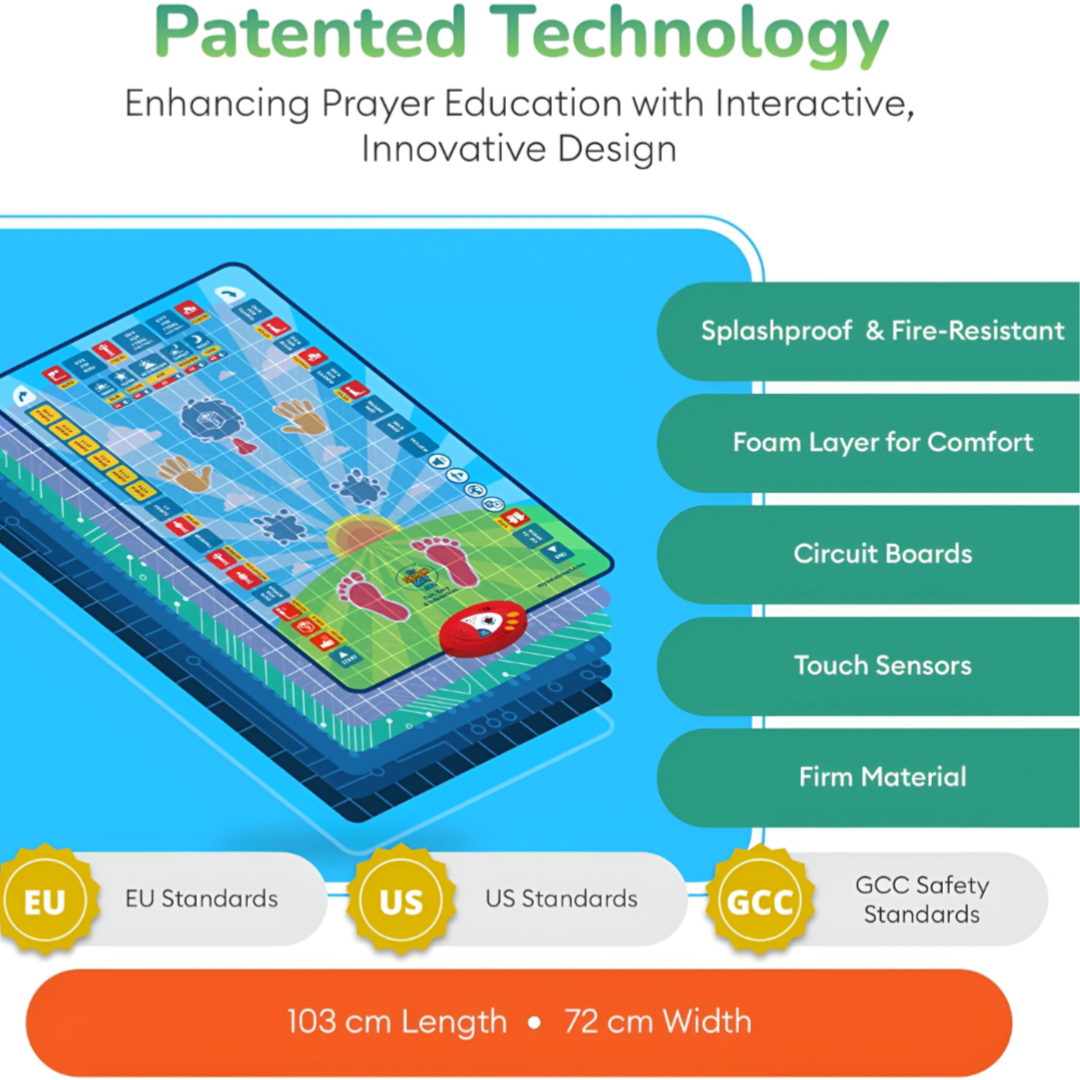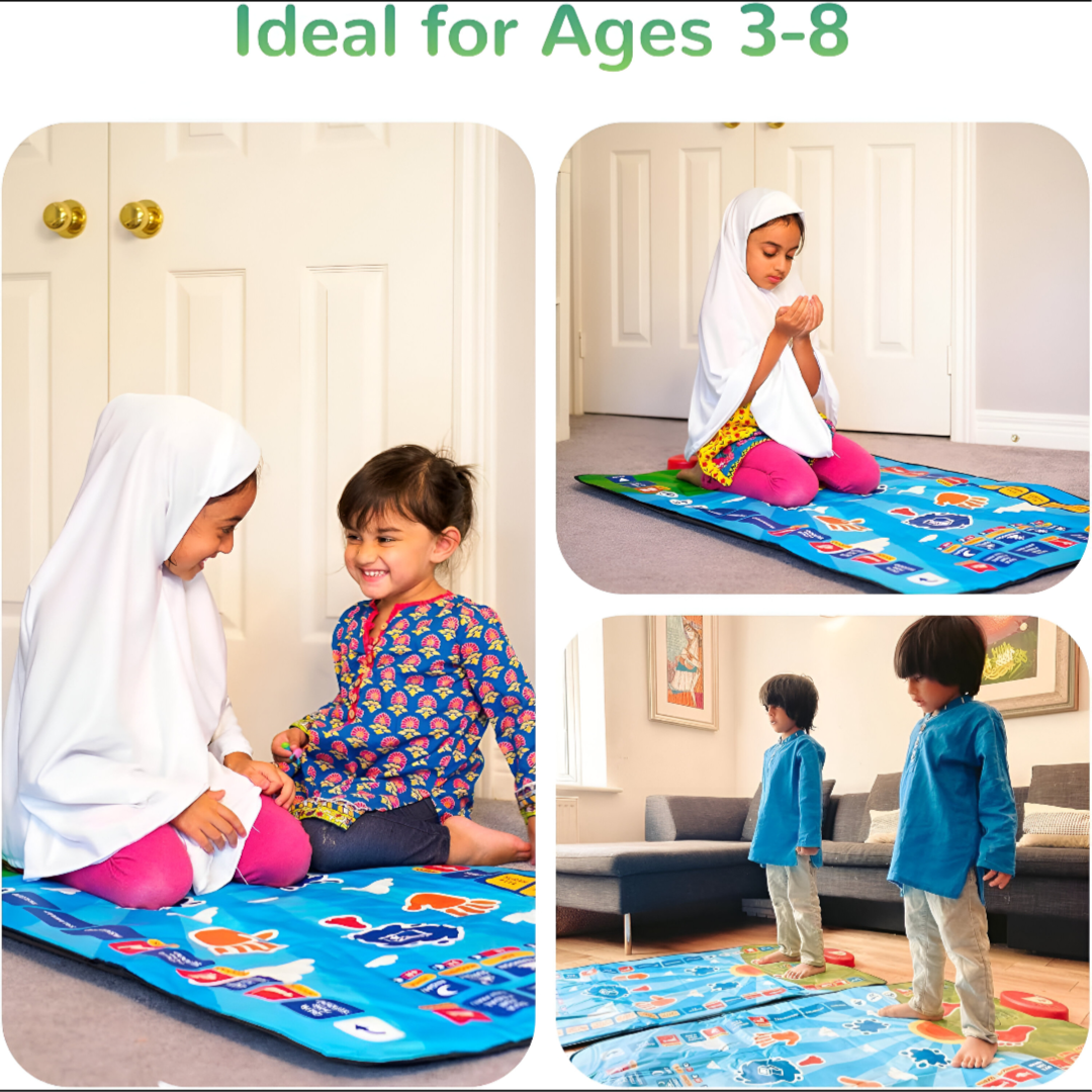 Interactive prayer mat for kids that combines learning with fun with 15 Languages - English, Arabic, German, French, Spanish, Urdu, Malaysian, Indonesian, Bengali, Russian, Turkish, Bosnia, Dutch, Swedish, Norwegian.