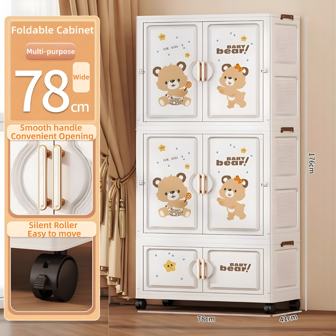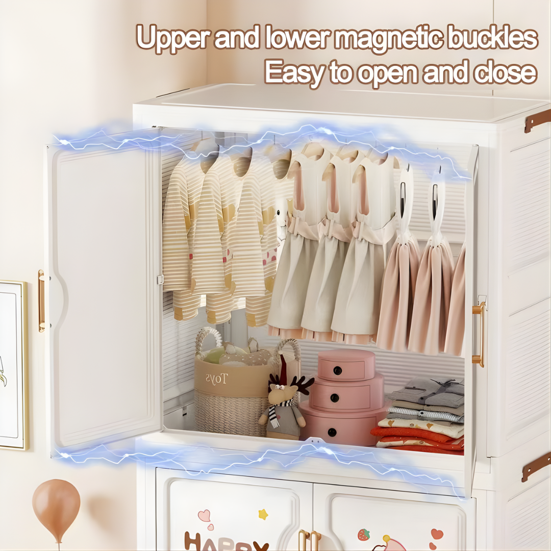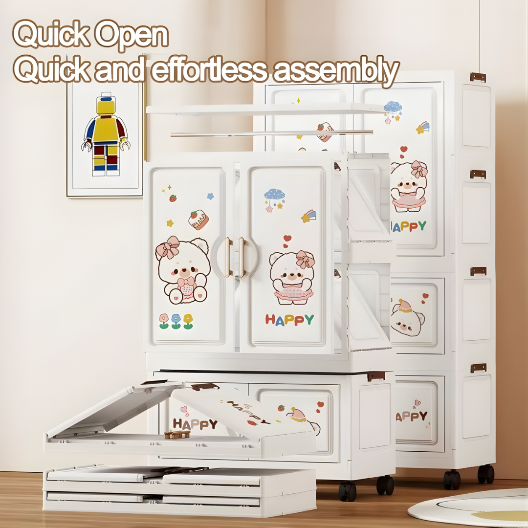 Adorable wardrobe made of durable plastic with spacious compartments and cute cartoon prints. Lightweight, portable with wheels, and perfect for...