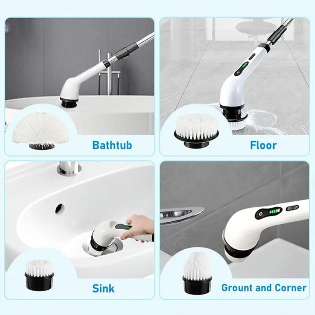 A versatile electric cleaning brush with an extendable handle designed for tackling hard-to-reach areas. This multi-purpose tool features a white and gold design with a powered rotating brush head, making it ideal for cleaning various surfaces including glass, tiles, bathrooms and ceilings.