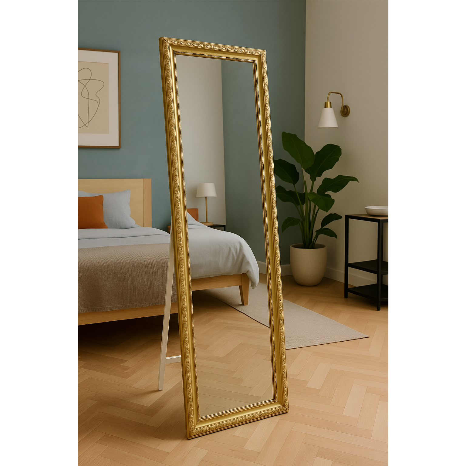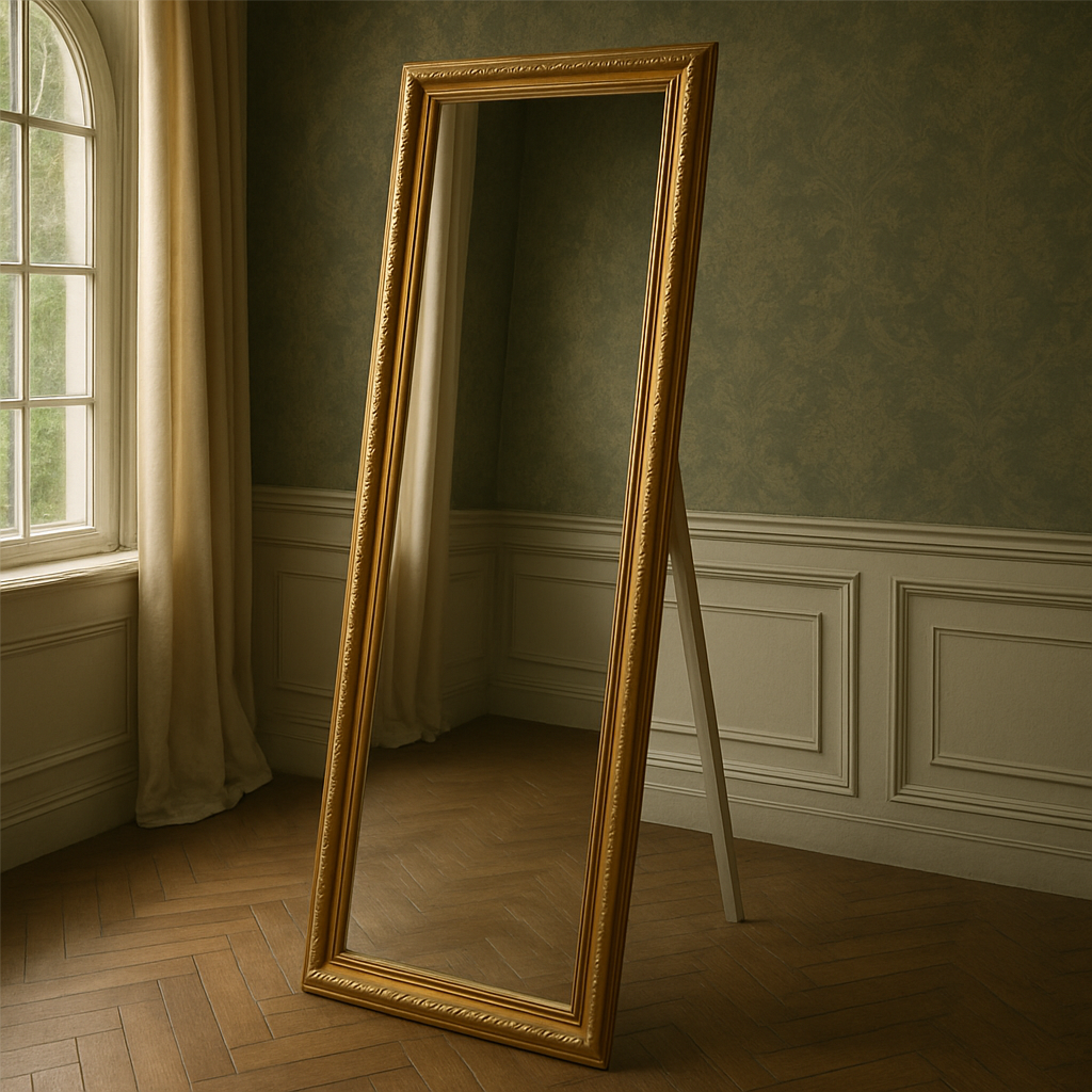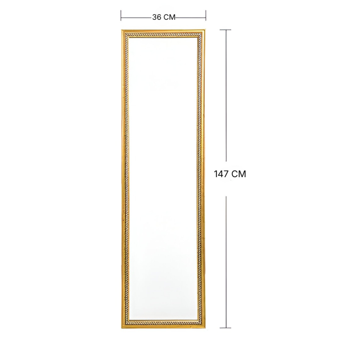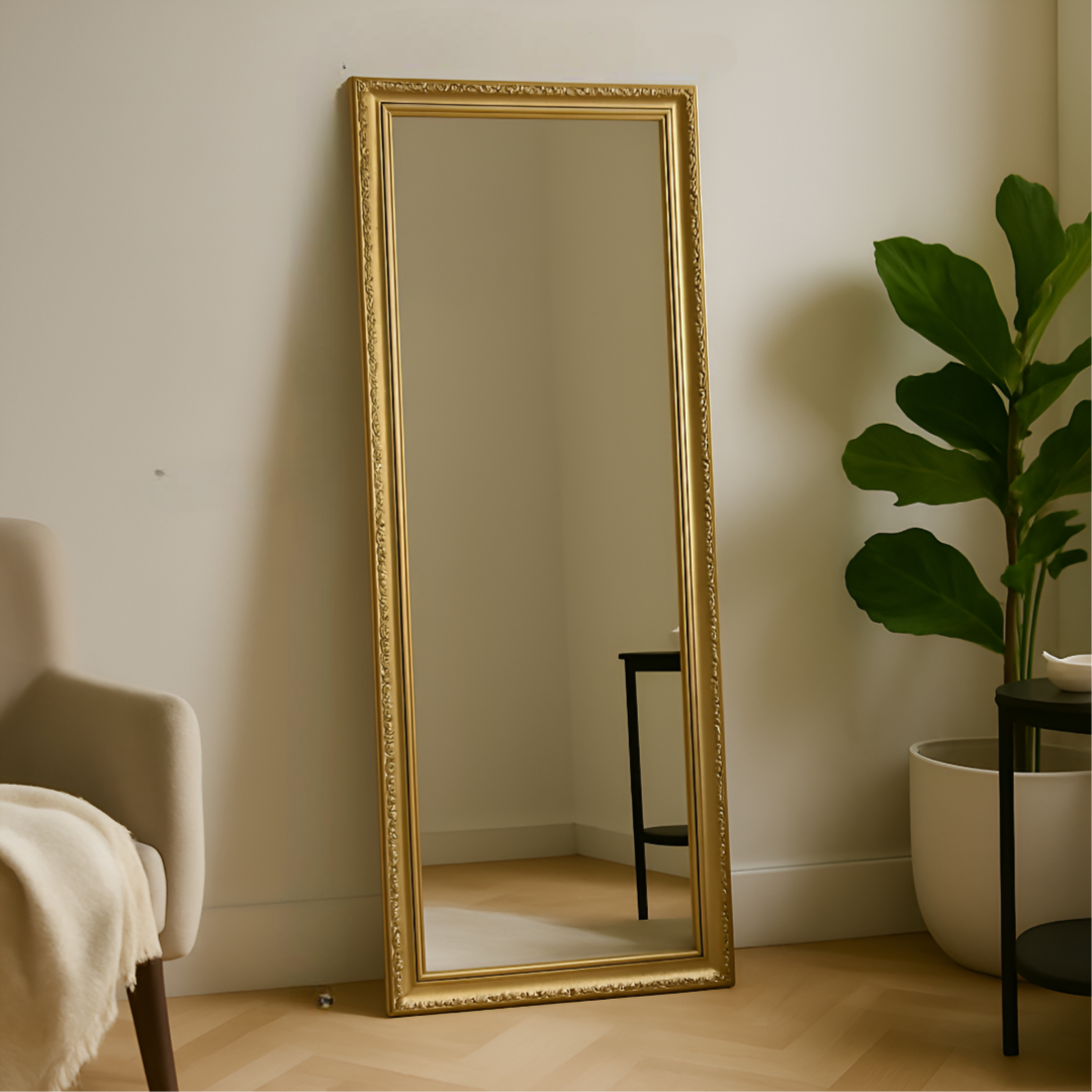 full-length mirror with an ornate golden frame. The frame has a classic design with decorative detailing along the edges, giving...