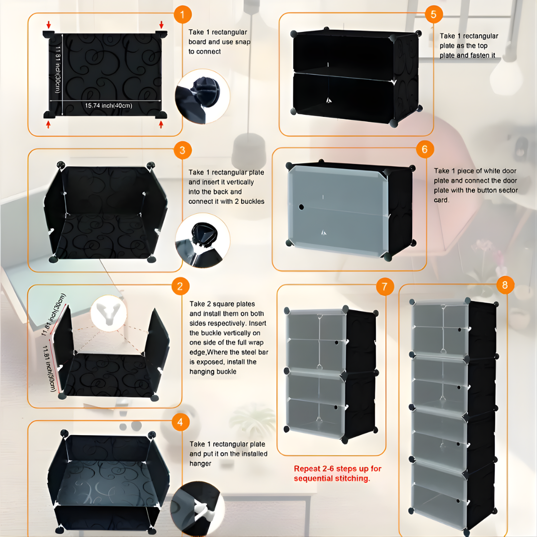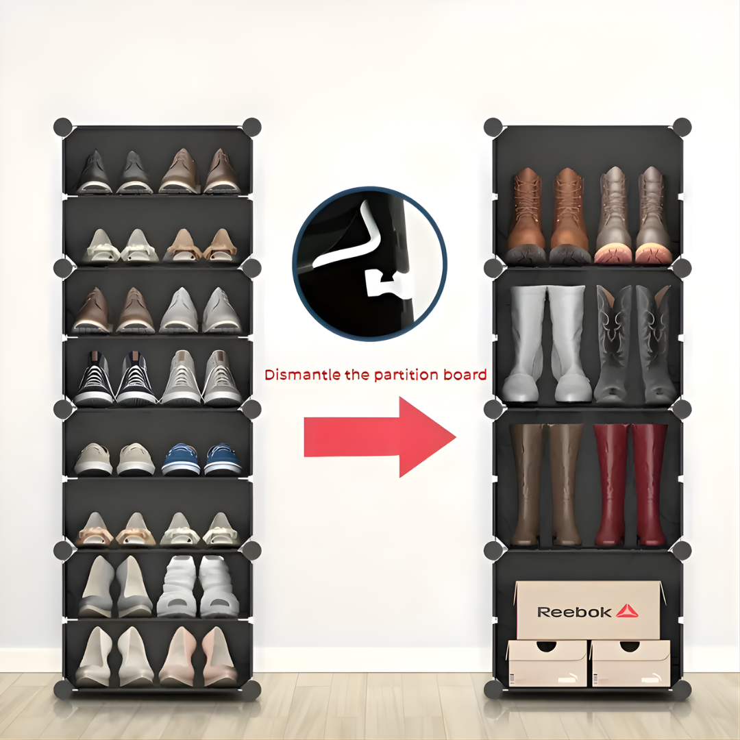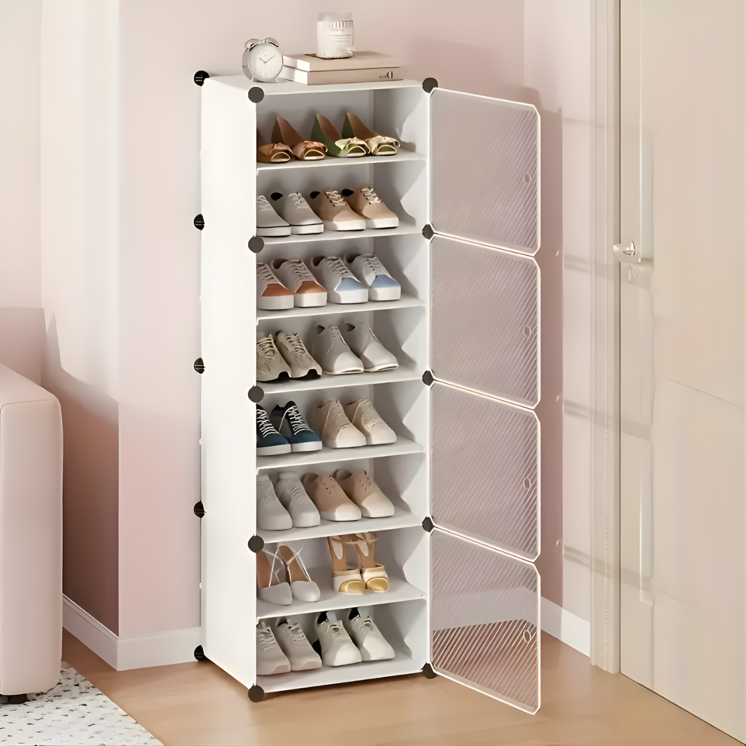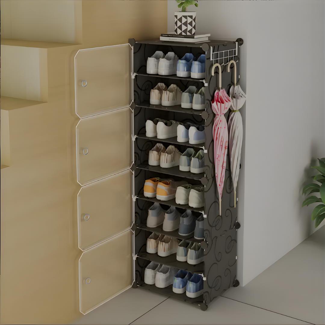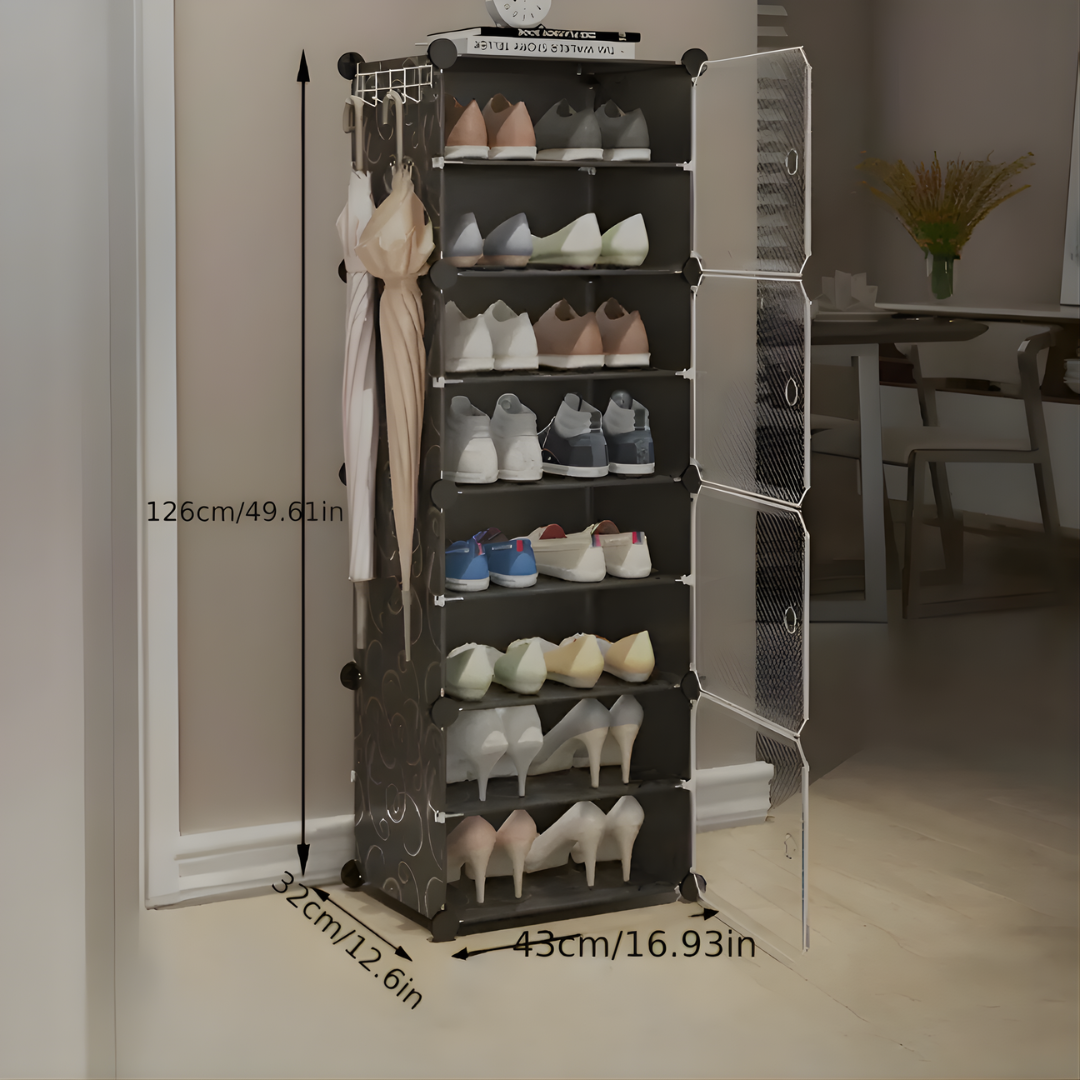 This elegant 8-layer shoe rack features a single column design with 4 transparent doors, offering a dustproof storage solution for multiple pairs of shoes. The cabinet-style organizer combines functionality with protection, keeping footwear neatly arranged while shielding them from dust and debris.