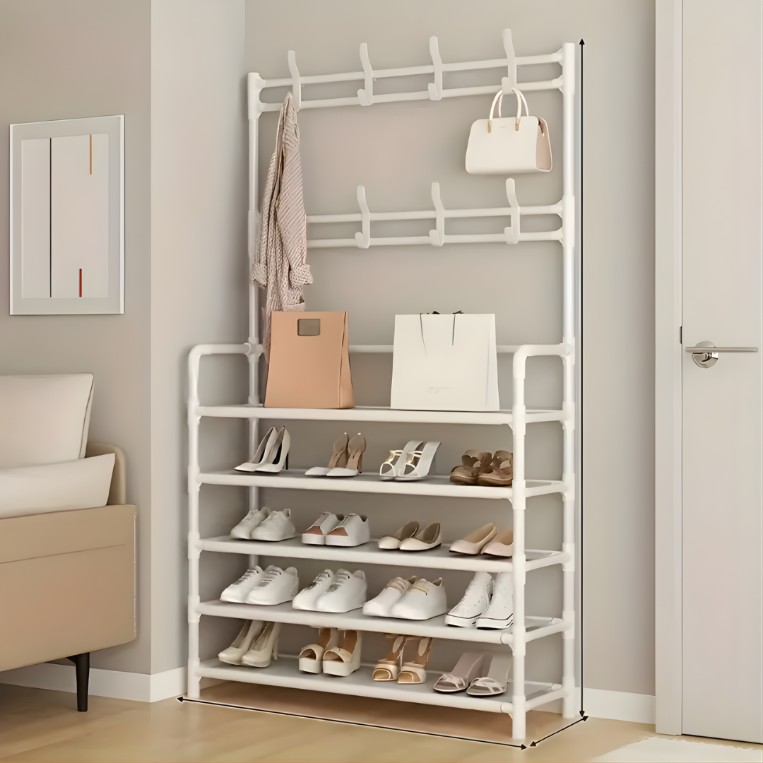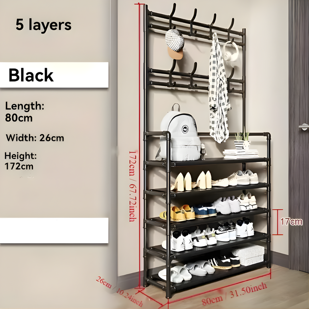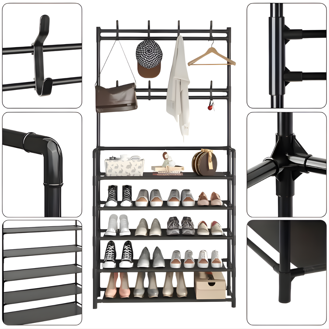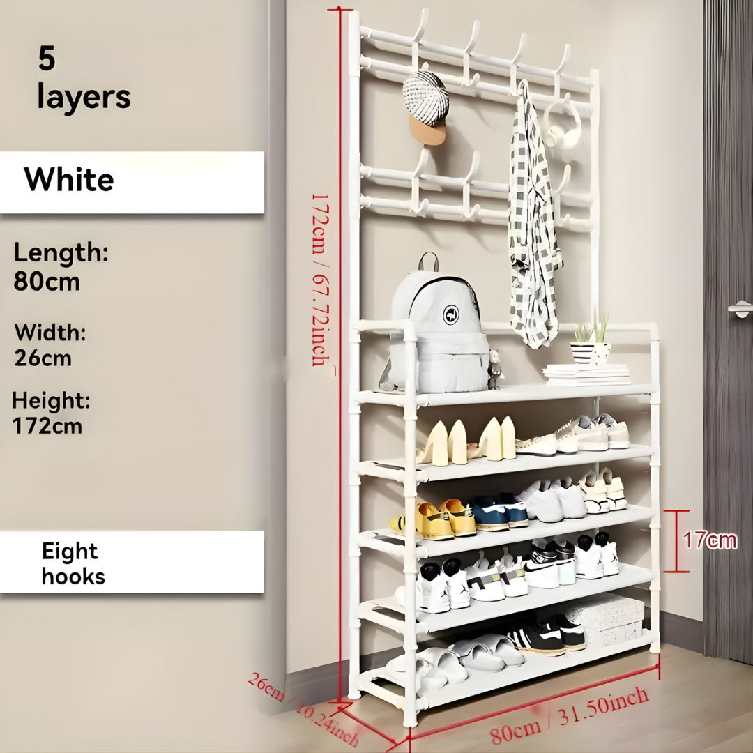 This shoe rack is the perfect solution for keeping your entryway tidy. Hang coats and hats on the top hooks,...