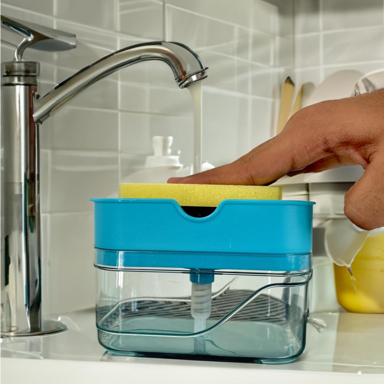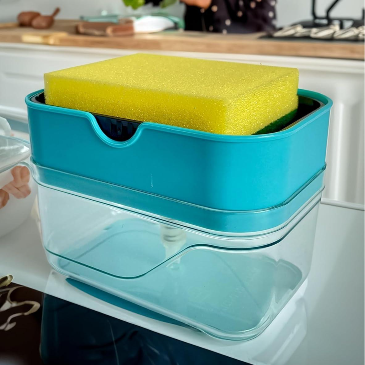 Fill it up with 13oz of your favourite dish soap, then use the included sponge to press down on the pump, which dispenses the perfect amount of dish soap up onto the sponge.