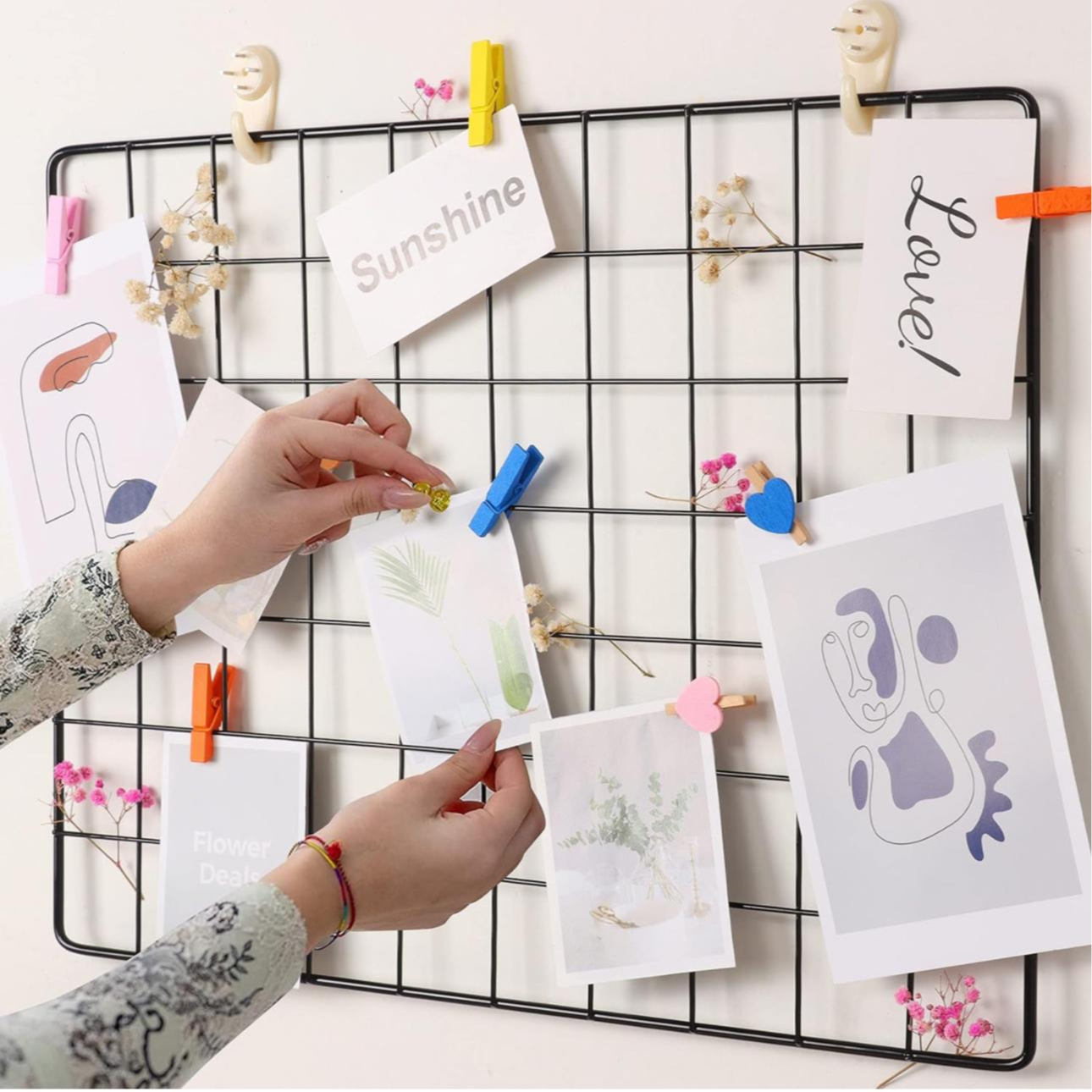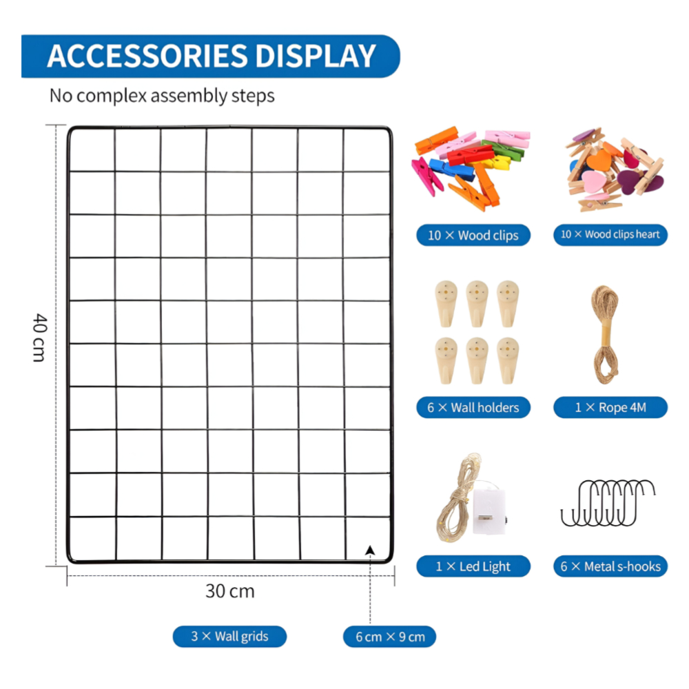 Wall Grid Panel for Photo Display, DIY Iron Picture Frames, Collage, Pictures Organizer Decoration Pin Board Memo with Led String...