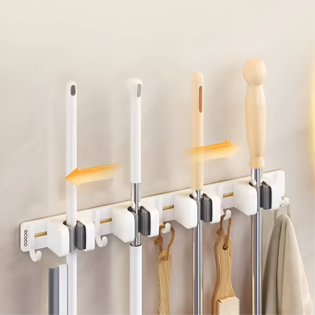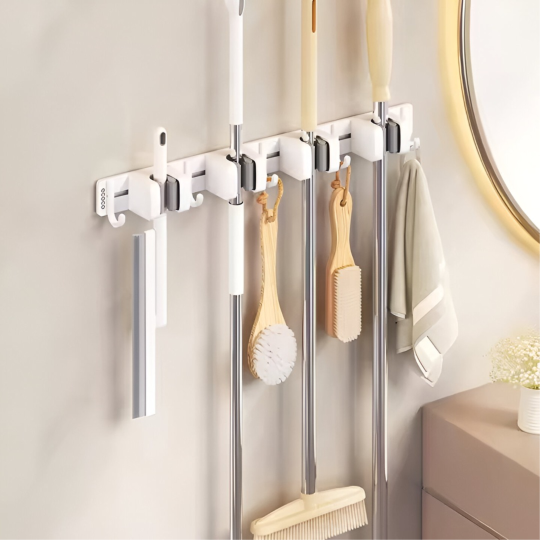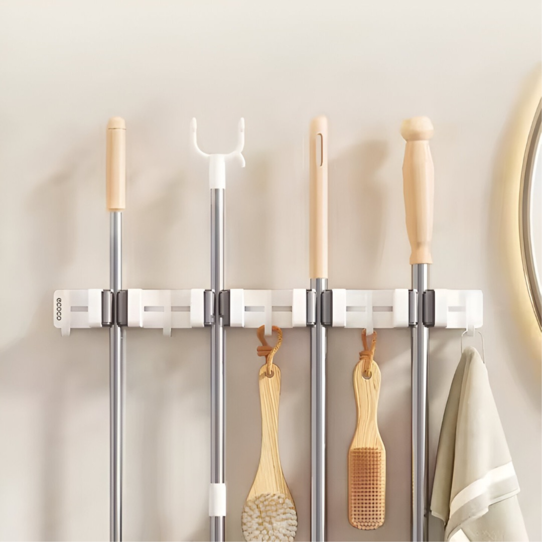 Keep your bathroom or utility area organized and clutter-free with this sleek wall-mounted cleaning tool rack. Designed with four secure grip slots and additional hooks, it’s perfect for storing brooms, mops, brushes, and other household tools.